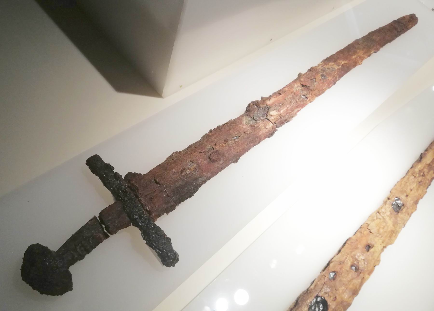 In gleicher Vitrine wie vorheriges Schwert sind diese beiden ausgestellt. Hierzu leider keine schriftlichen Hinweise. Erwähnenswert ist das Vorhandensein der Scheiden, fest verbacken mit den Klingen.