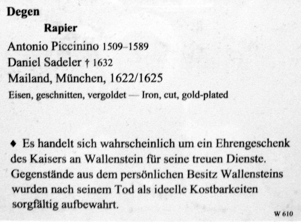 Gleich zwei bedeutende Namen werden als Hersteller erwähnt, Antonio Piccinino (einer der führenden italienischen Klingenschmiede des 16. Jh.) und Daniel Sadeler (Eisenschneider, München).
