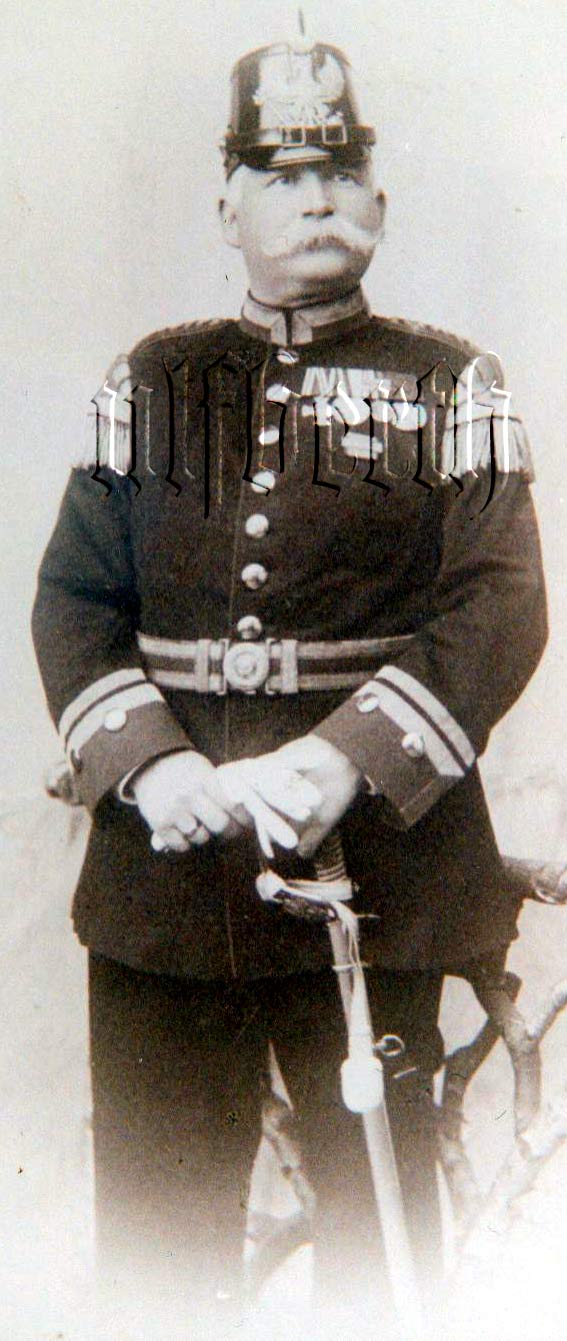 Lauenburgischen Jäger-Bataillon Nr. 9. Die Aufnahme dürfte um 1898 entstanden sein, da er am Infanterie-Offizier-Degen n/M noch das 89er Portepees mit silbernen - mit weißem Leder unterlegten - Band trägt. Erst 1896 wurde von den Offizieren (excl. Feldwebel und Fähnriche - diese erst ab 1898) das Kavallerie-Portepee mit schwarzem, von drei silbernen Streifen durchzogene Lederband, verwendet.