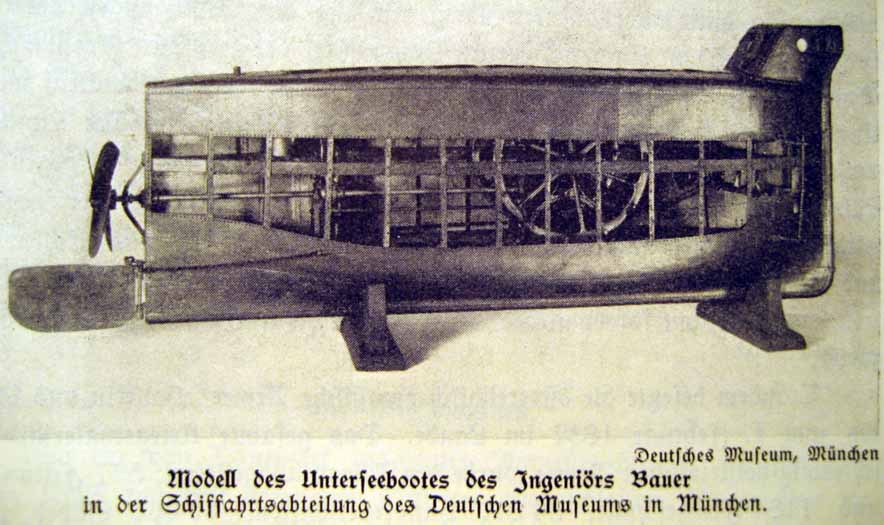 Bauer, der freilich noch mißglückte. Bauer, der bayerischer Artillerieunteroffizier gewesen war, erbaute während des Krimkrieges auch für Rußland ein Unterseeboot. Bauers Büste ist im Deutschen Museum in München in der Schiffahrtsabteilung aufgestellt. Auch Minen mit elektrischer Zündung, eine Konstruktion des Artillerieleutnants