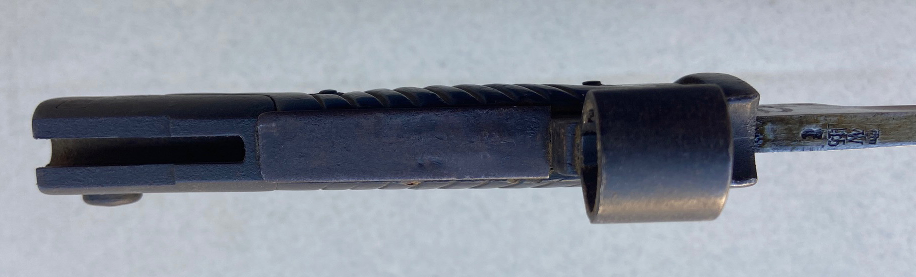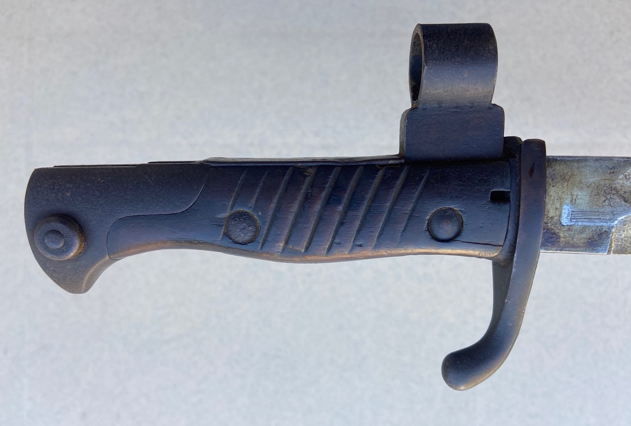 je suis collectionneur français et j'écrits des livres sur les baïonnettes allemandes. J'ai acheté cette baïonnette il y a quelques jours et je nesavais pas sur quel fusil elle se fixait. Après des recherches, un ami collectionneur a trouvé le fusil sur lequel ma baïonnette s'adpaté parfaitement. Je ne vous donne pas la réponse de suite, j'attends que vous le deviniez si vous le souhaitez. Qui a déjà vu une modification comme celle là ? ce n'est pas un bricolage mais une modification d'amurerie ou même d'arsenal. Merci de vos réponses. J'avais écrits un ouvrage sur les baïonnettes ersatz en allemand, mais ce modèle n'est pas présent.
