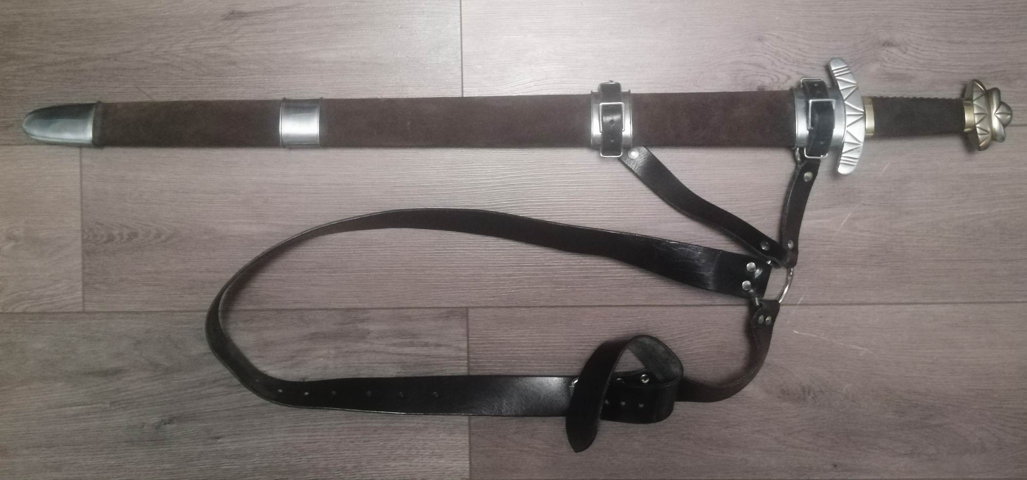 Die Klinge ist aus Kohlenstoffstahl geschmiedet. Knauf und Parierstange mit Kupfer verziert.
