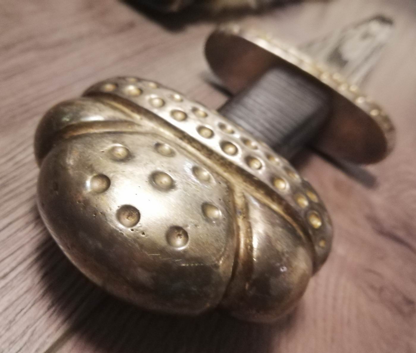 Bei bisher alle von mir im Netz gefundenen Beispiele haben weiß montierte Beschläge und Griffteile. Warum das vorliegende Schwert gelb montiert ist habe ich noch nicht herausgefunden. Der an der Scheide befindliche blaue Stein und das Stück Rehgeweih wurde vom Vorbesitzer dran gemacht.
