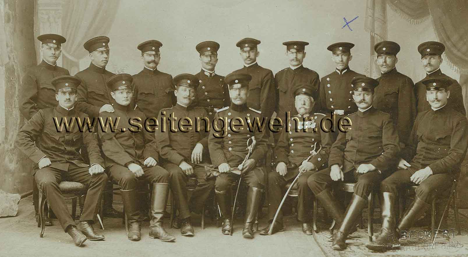 Zur Verdeutlichung einmal bayerische Grenzaufseher in Oberaudorf am Inn nach 1903. Auch hier dürfte das Modell zu sehen sein. Das dunklere Messinggefäß (gegenüber den silbernen Knöpfen und der Kragenstickerei) ist hoffentlich auf dem Monitor zu erkennen.