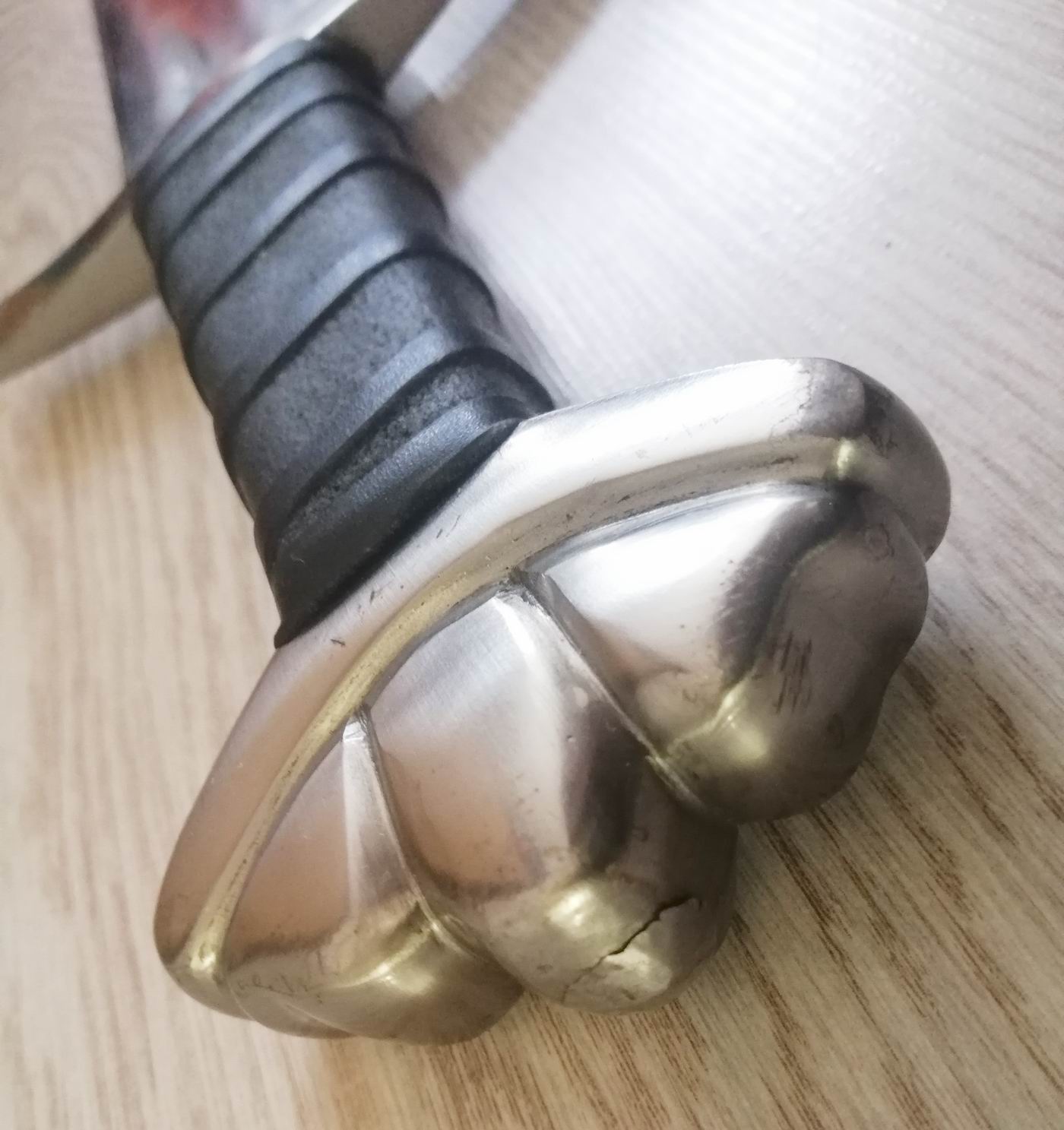 Der Knauf ist mit der Angel vernietet. Die Griffumwicklung aus Leder fühlt sich an wie Gummi. Charakteristisch für die mehr funktionale als Scheide aus dickem Leder ist die Trageschlaufe am oberen Beschlag und das stumpfe Ortblech.