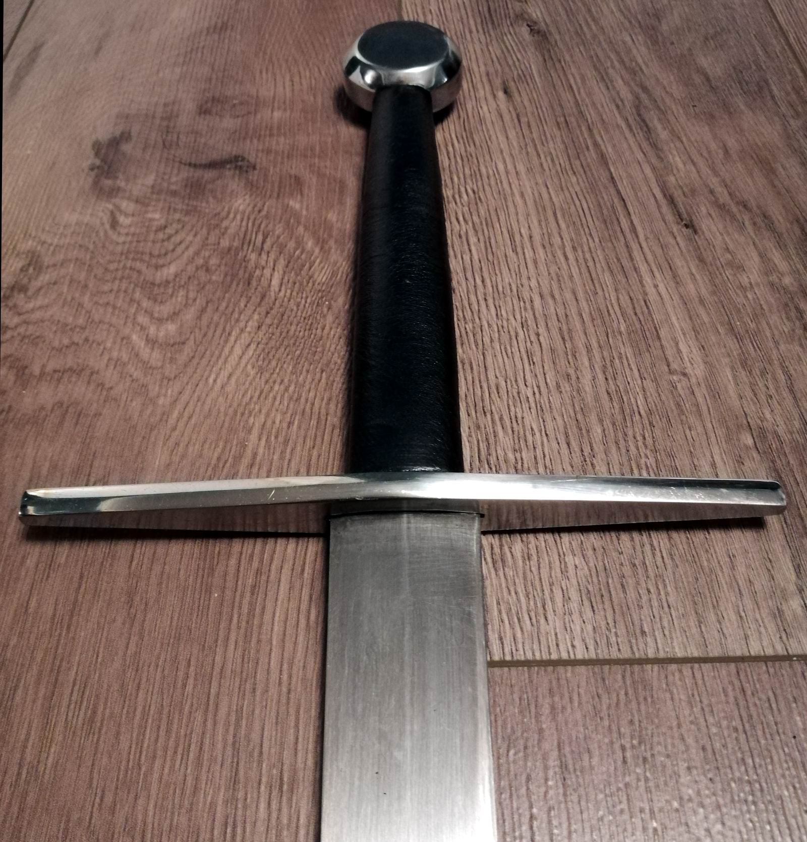 Es gibt zu diesem Schwert vier Klingen-Versionen. Eine mit Hohlkehle und diese hier, mit rauten- bzw. diamantförmigem Klingenquerschnitt, jeweils in scharfer und stumpfer Ausführung. Die Klingen sind aus 5160er Federstahl geschmiedet, gehärtet auf 50-53 Hrc. Die Angel hat eine Härte von ca. 30 Hrc und ist mit einer in den Knauf versenkten Inbusmutter verschraubt. Das ermöglicht das Austauschen der Klingen.