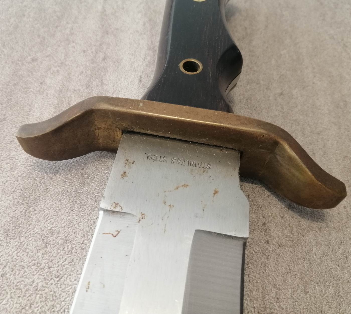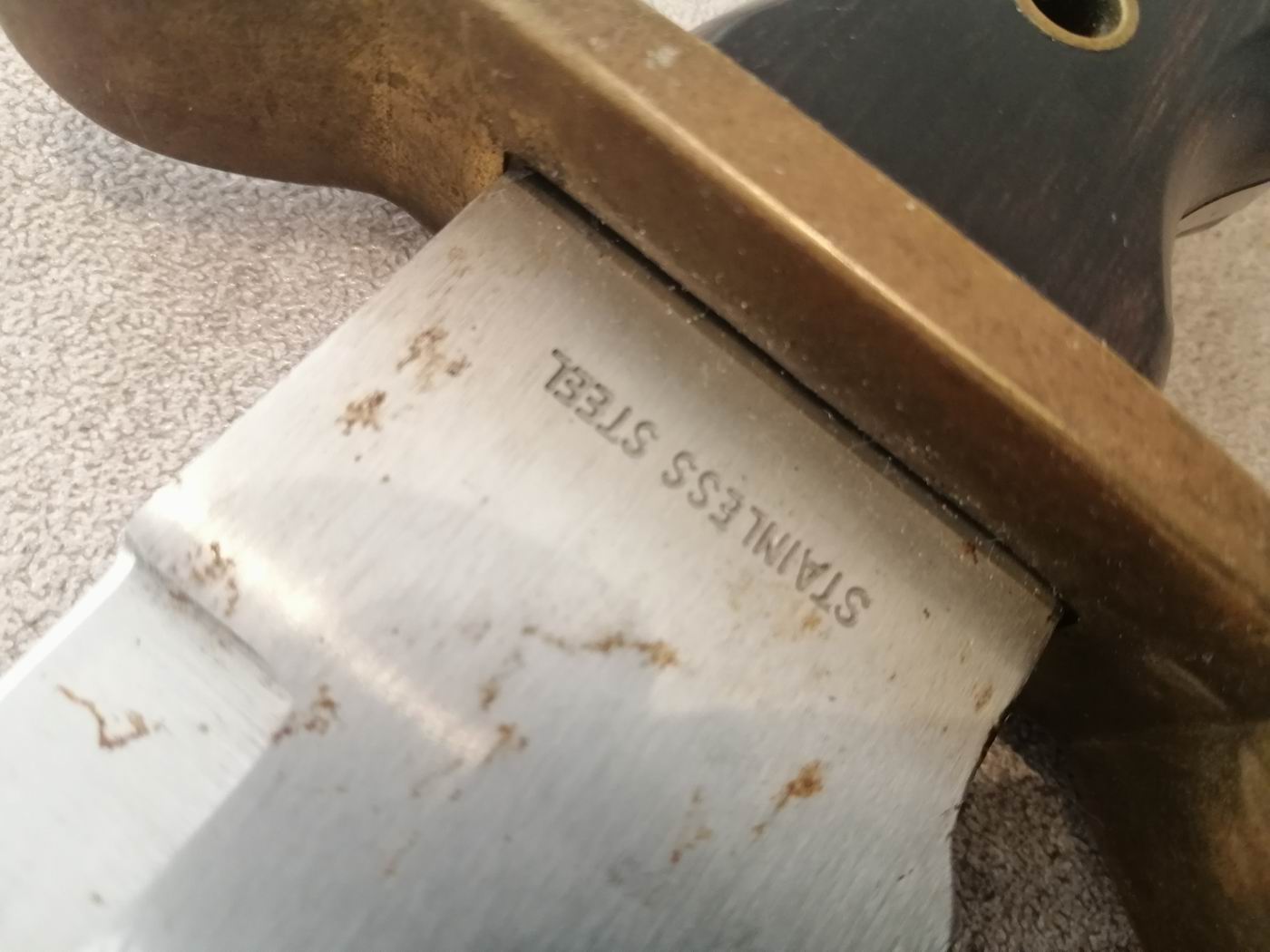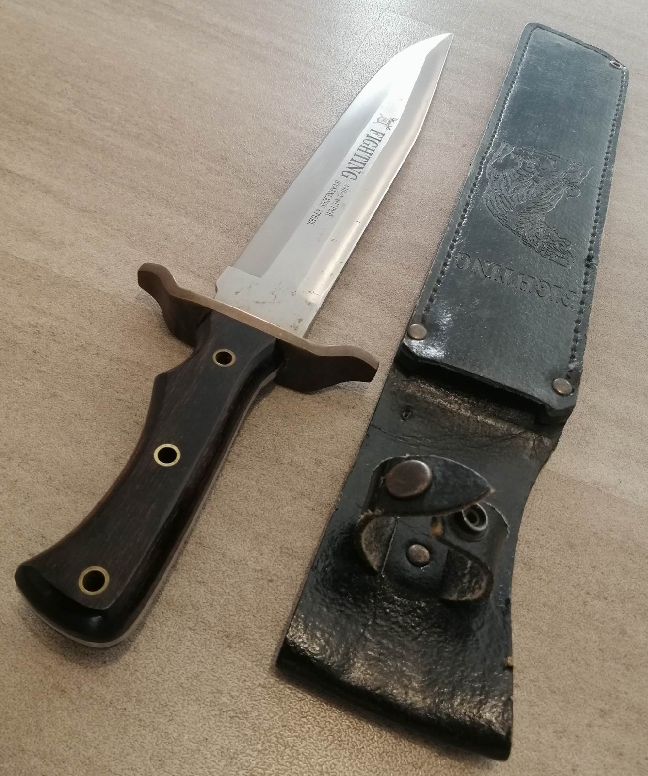 Die zweischneidige Klinge mit der Inschrift FIGHTING ist aus 440-A Super Stainless Steel. Einseitig sind als Marke ein Schild mit gotischem/altenglischem G, dahinter zwei gekreuzte (spanische?) Schwerter.