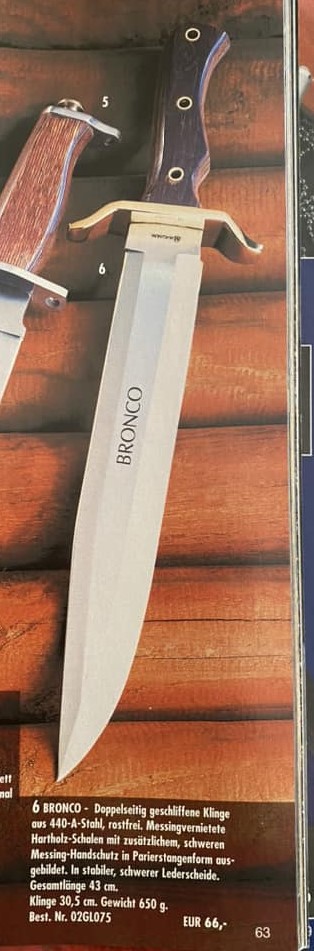 Durch neue Recherche wurde mir das Messer unter der abweichenden Bezeichnung "BRONCO" im Magnum-Katalog (Vorgänger von Böker) von 2002 gezeigt.