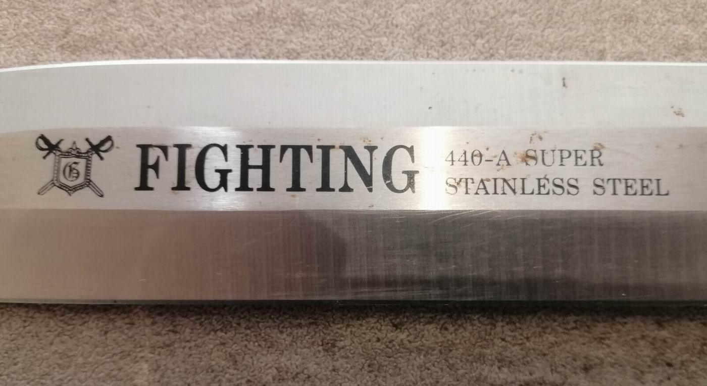 Die zweischneidige Klinge mit der Inschrift FIGHTING ist aus 440-A Super Stainless Steel. Einseitig sind als Marke ein Schild mit gotischem/altenglischem G, dahinter zwei gekreuzte (spanische?) Schwerter.