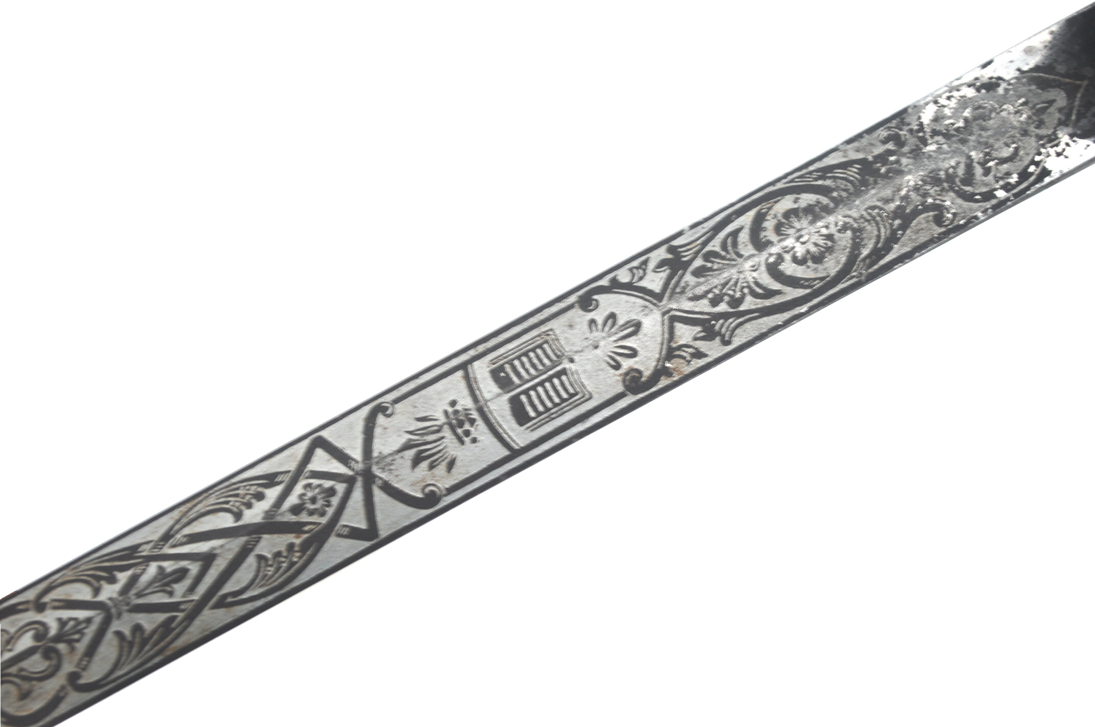 zweischneidige Degenklinge ohne Hohlkehlen mit Ätzdekor, Mittelspitze