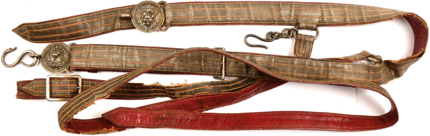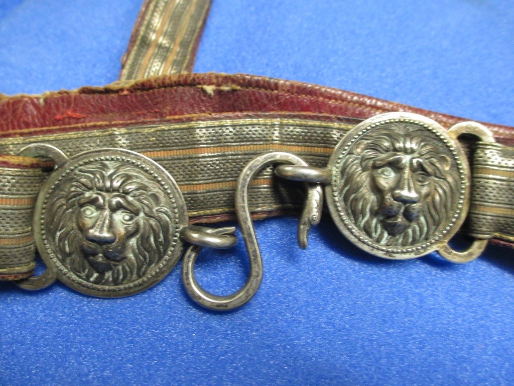 Am rechten Gürteltheile eine Schnalle von 1´´ 3´´´Breite. Zum Verschluss zwei silberne Löwenköpfe von 1´´ 5´´´Durchmesser mit Schlange. Der linke Gürtetheil setzt sich unter dem Koppelschloss fort, und wird durch eine am rechten Gürteltheile zwischen Schloss und Schnalle befindliche bewegliche Schlaufe durchgesteckt. An den Trageschleifen unten Doppelschnallen 1´´ 3´´´ lang und 1´´ 1´´´breit. Am Ovalring der vorderen Trageschleife ein aus vier Gliedern bestehendes Silberkettchen mit einem Haken zum einhängen des Säbels. Das für den feldmäßigen Anzug gestattete Säbelkuppel von schwarz-lackiertem Leder hat die gleiche Form.“(1)