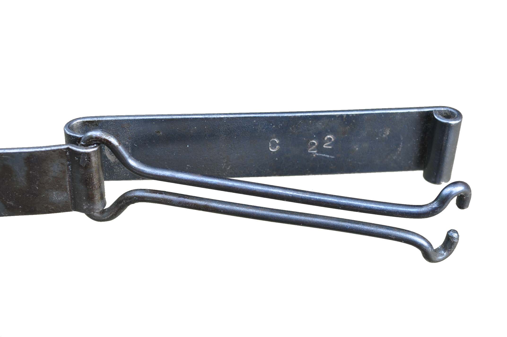 brünierte Stahlblechscheide, breiter Stahlblechhänger mit Drahtverschluß