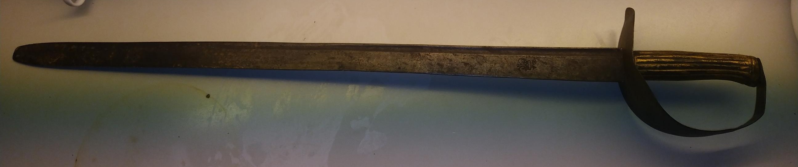 Ein freund hat ein cutlass (?) als er zu identifizieren wünschen. Es gibt ein klares cypher, aber ich kenne es nicht. Es könnte "Victoria Rex" meinen, aber ich bin nicht sicher. Es heisst in seiner familie das der cutlass auf "Napoleonzeiten" ist.
