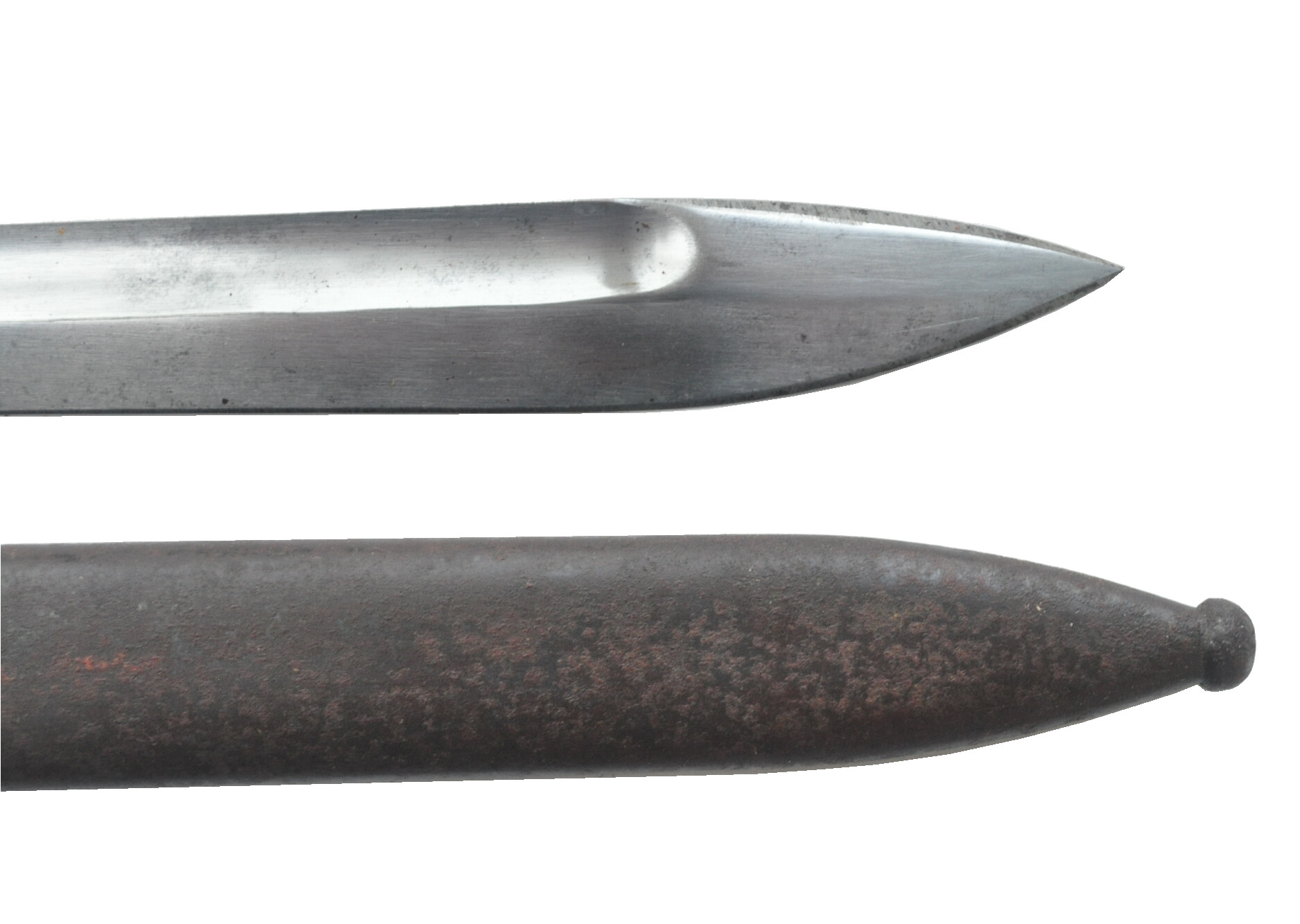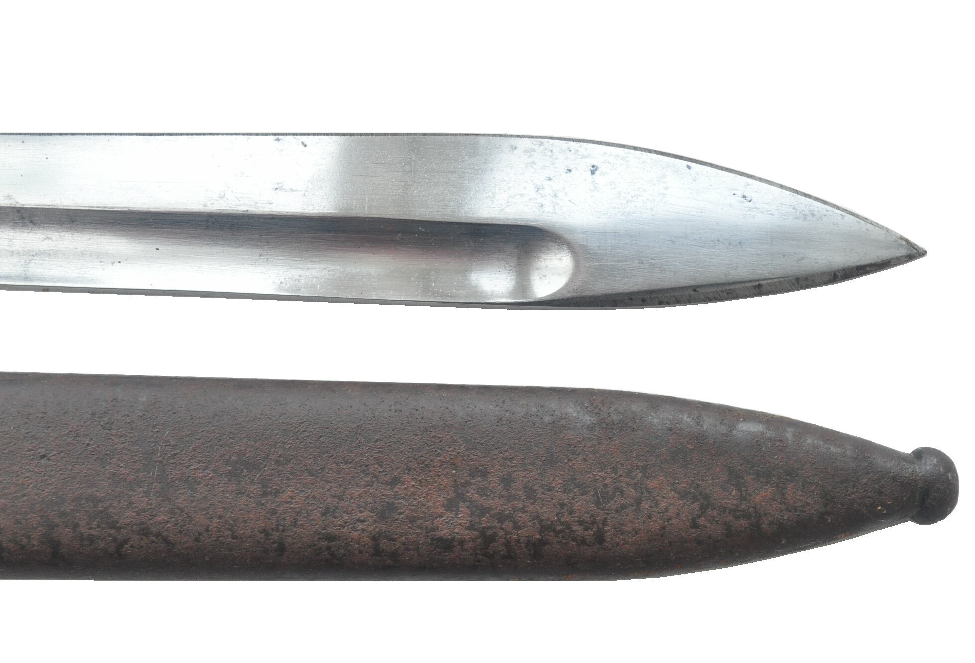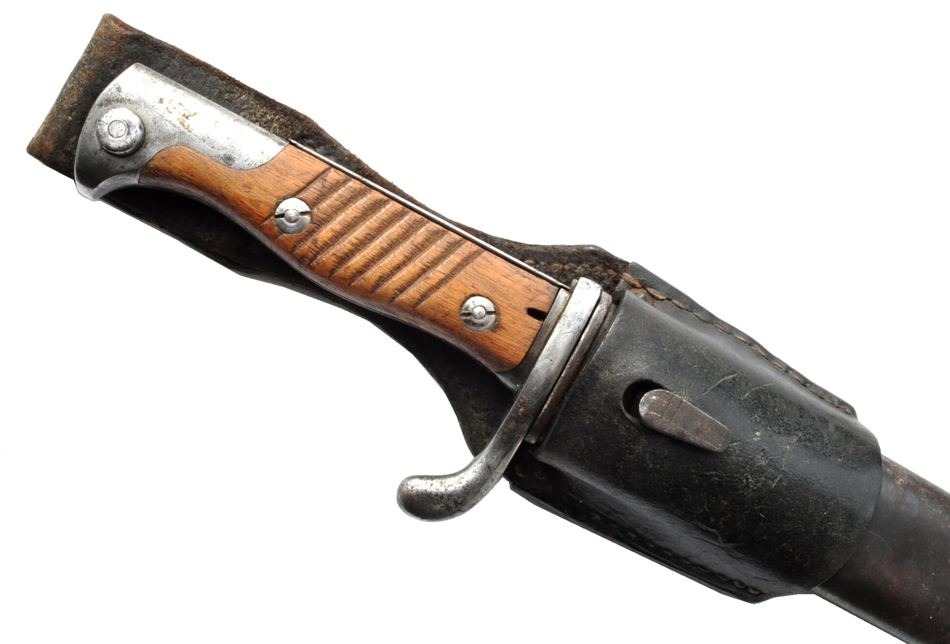 brünierte Stahlblechscheide mit Ortknopf, Haltefedereinsatz mit Schraube auf Tragehakenseite gesichert