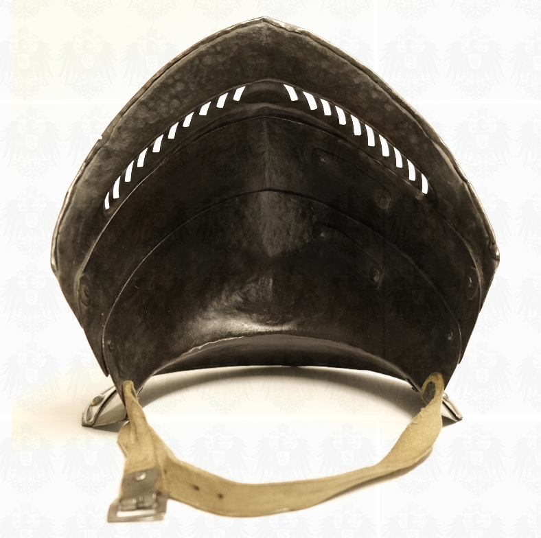 Befestigt wird das ganze durch einen Lederriemen, der seitlich über der Sturmhaube nach hinten verläuft und dort mit einer Schnalle verschlossen wird.