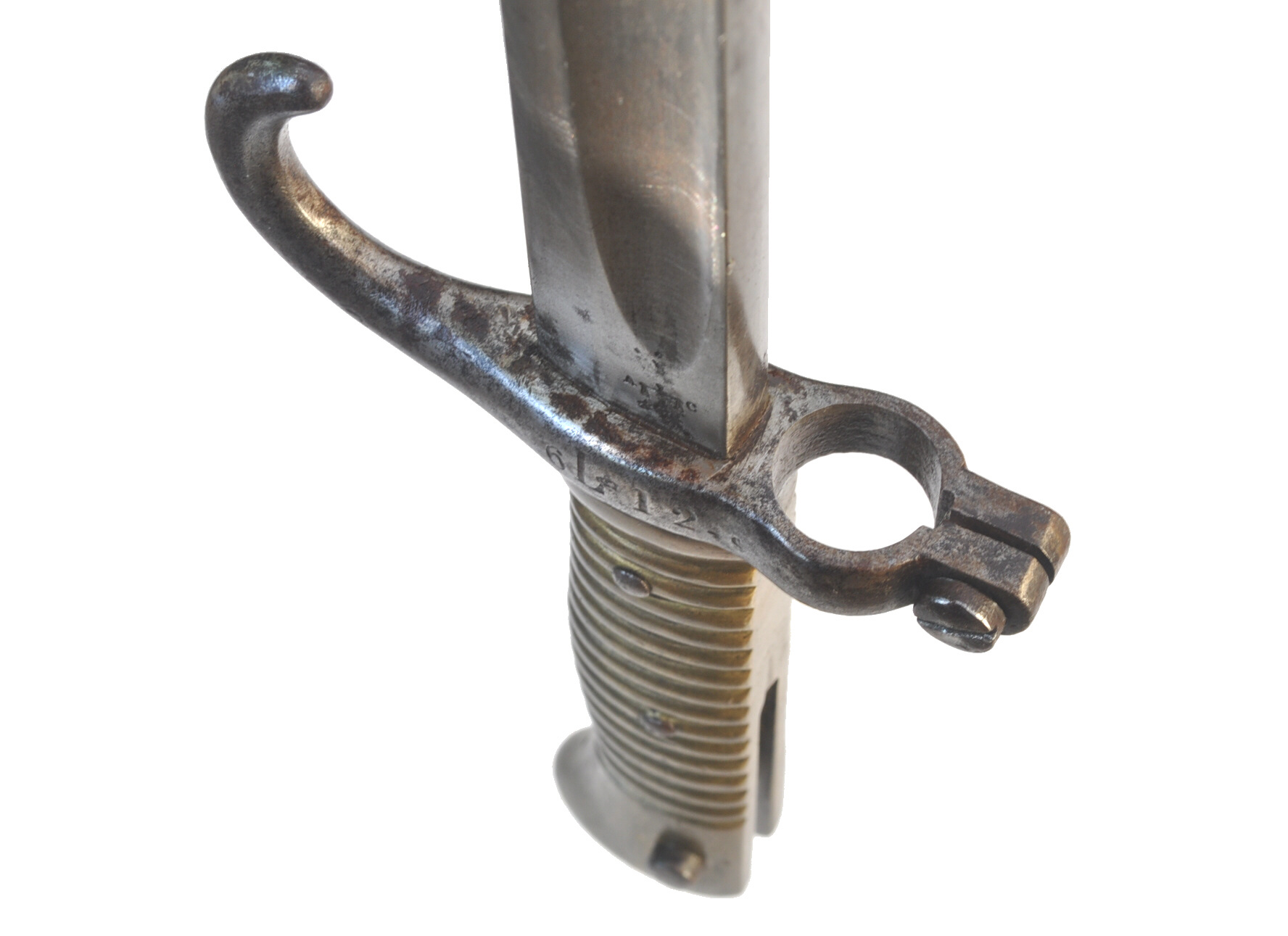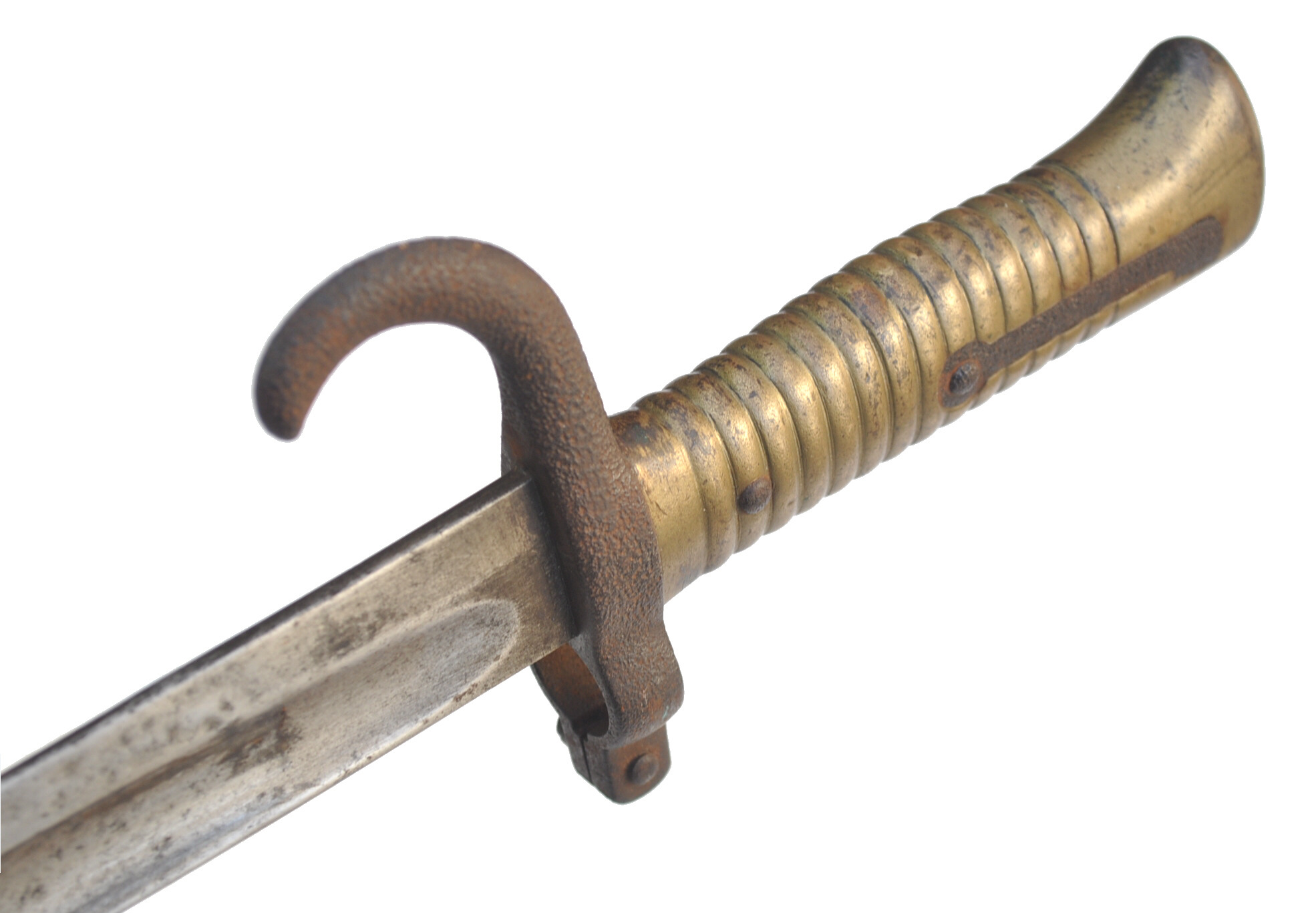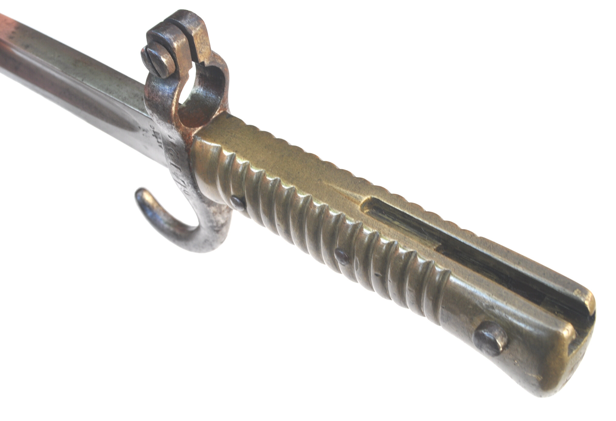 Messinggriff mit 15 Rippen, durch 2 Eisenniete mit der Angel vernietet