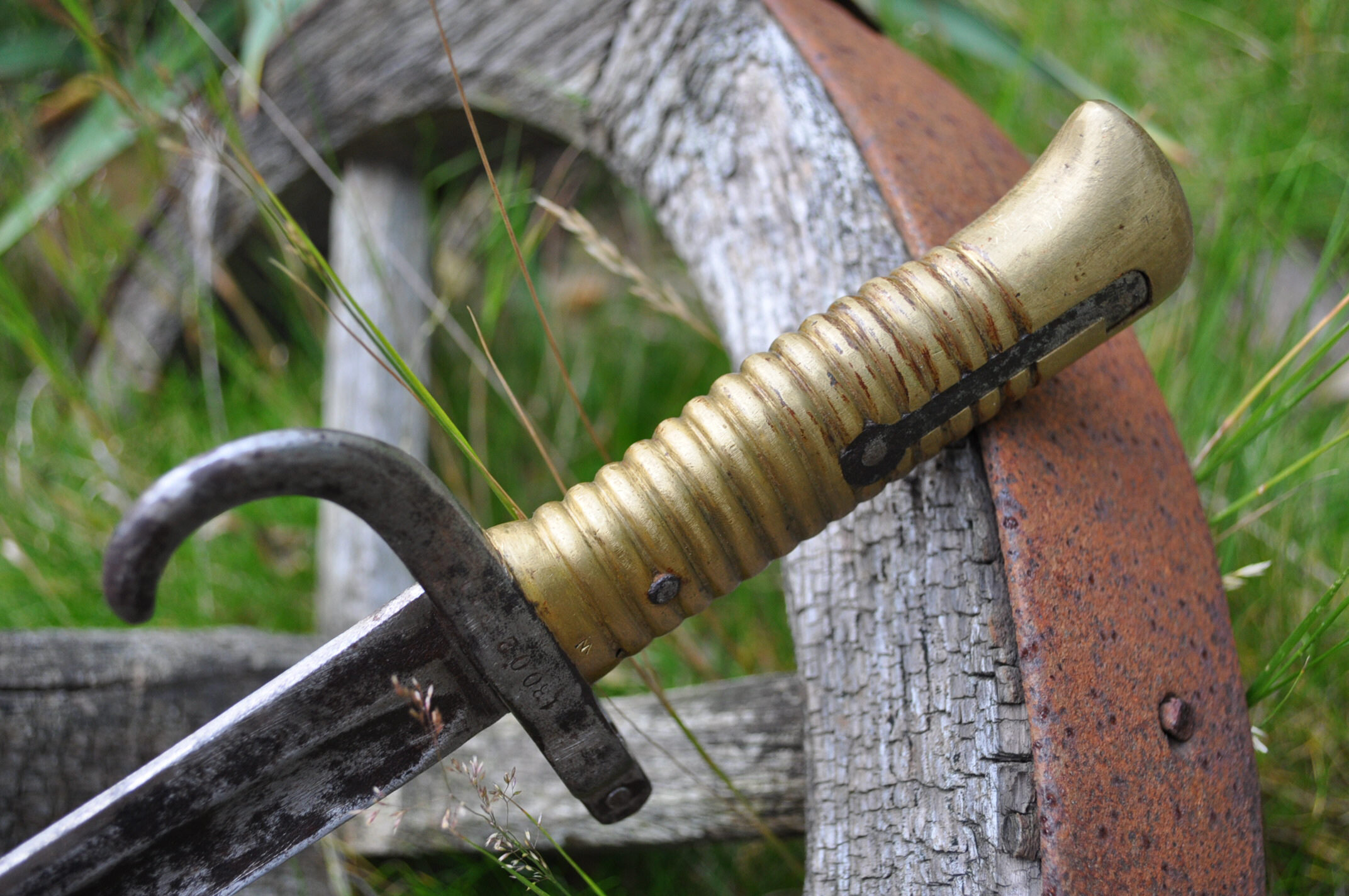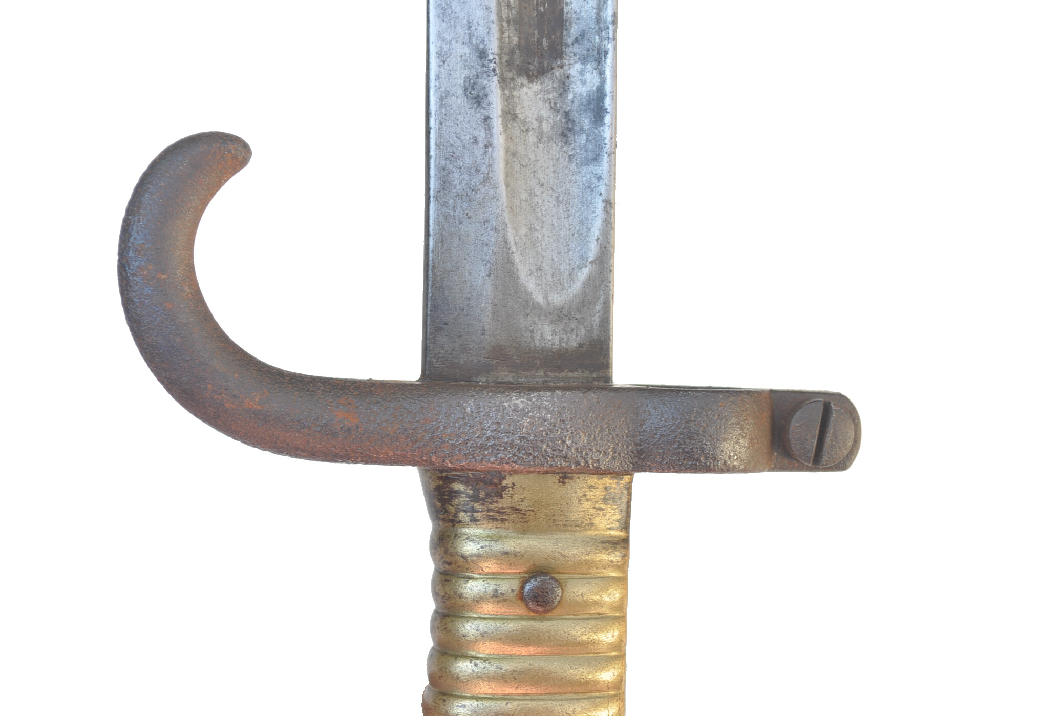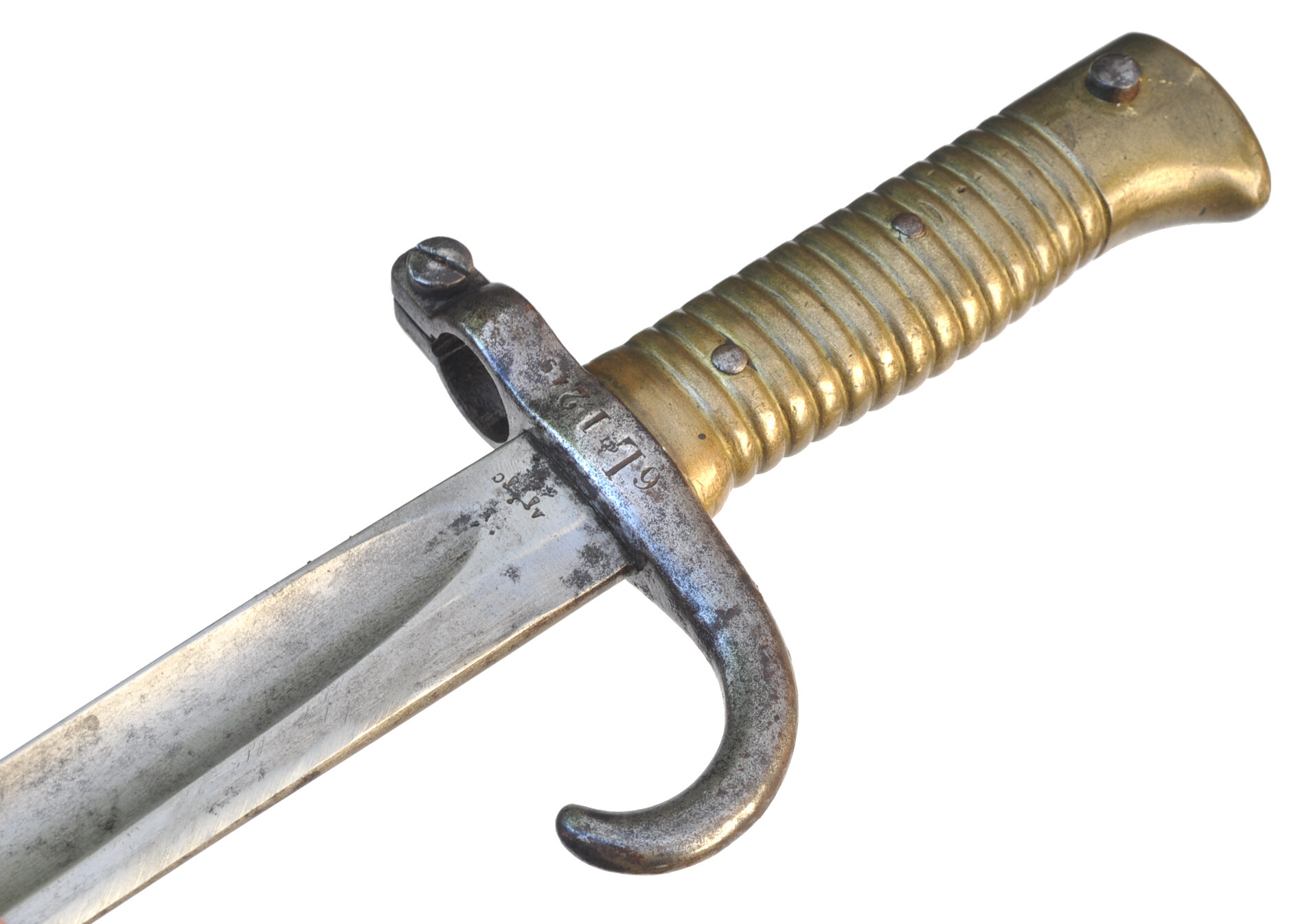Messinggriff mit 15 Rippen, durch 2 Eisenniete mit der Angel vernietet