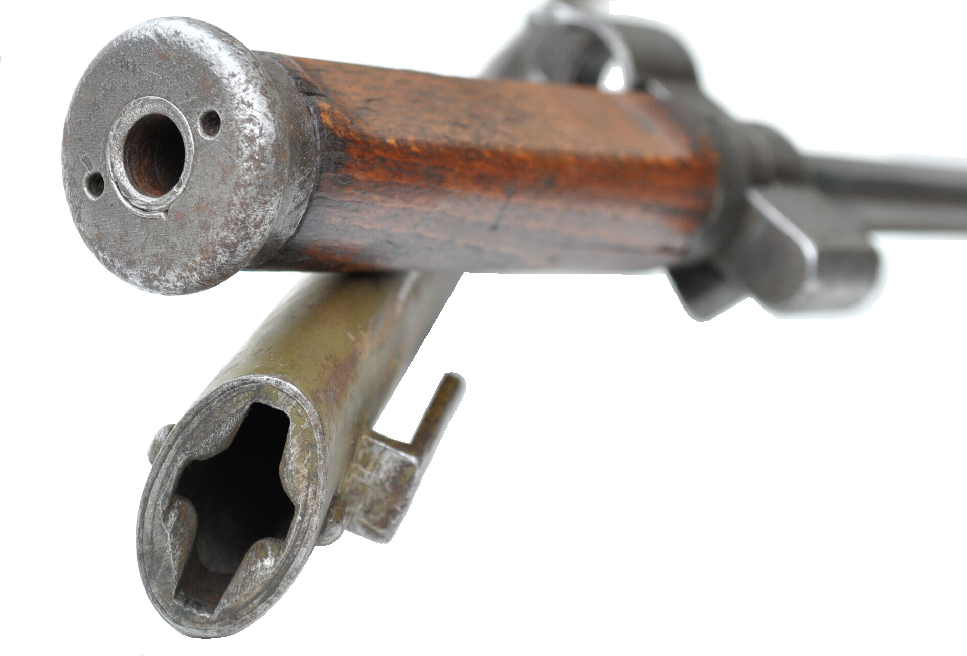 mit der Angel vernietetes Parierstück aus Eisen mit Laufring und Lebel Verriegelungssystem