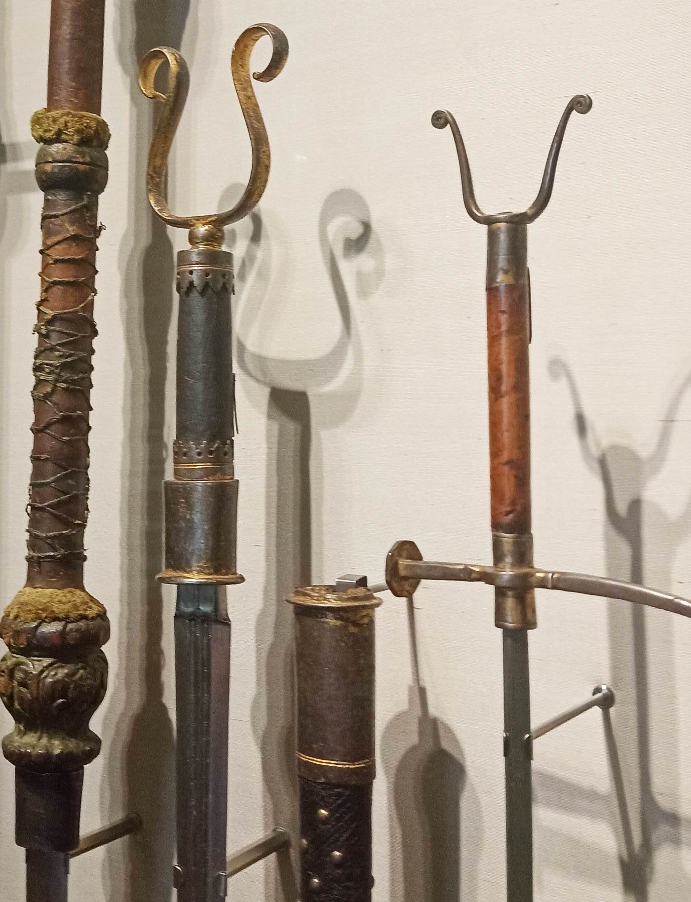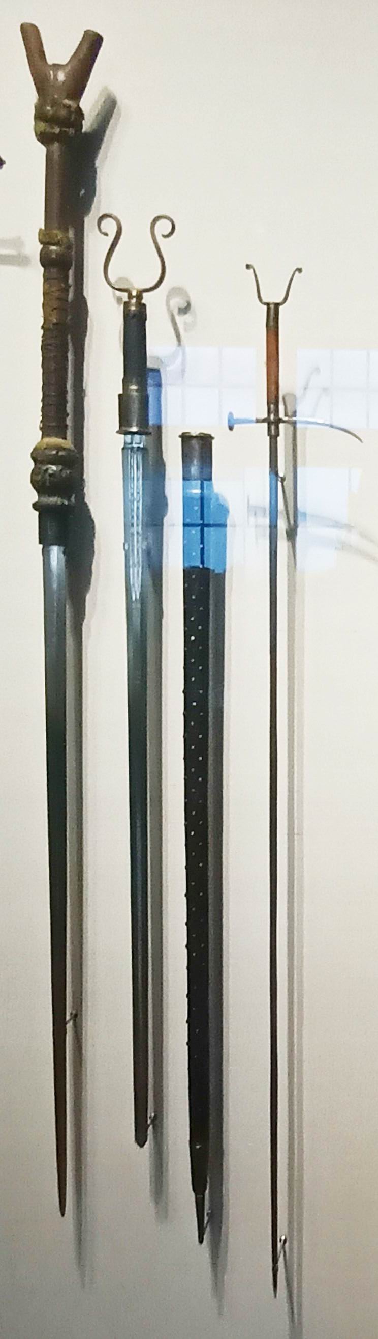 Kombination von Stockdegen mit Gewehrgabeln und bei einem zusätzlich noch mit einem kleinen Streithammer.