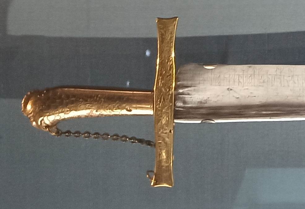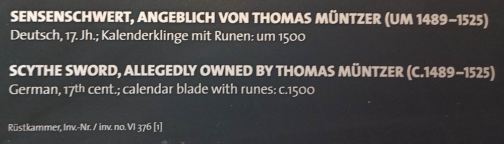 Angeblich ein Schwert von Thomas Müntzer (* um 1489 † 27. Mai 1525). Da frage ich mich, wie das zeitlich mit dem 17. Jh. passen kann? Nachträglicher Griff? Außerdem ist der Griff falsch herum an der Klinge befestigt.