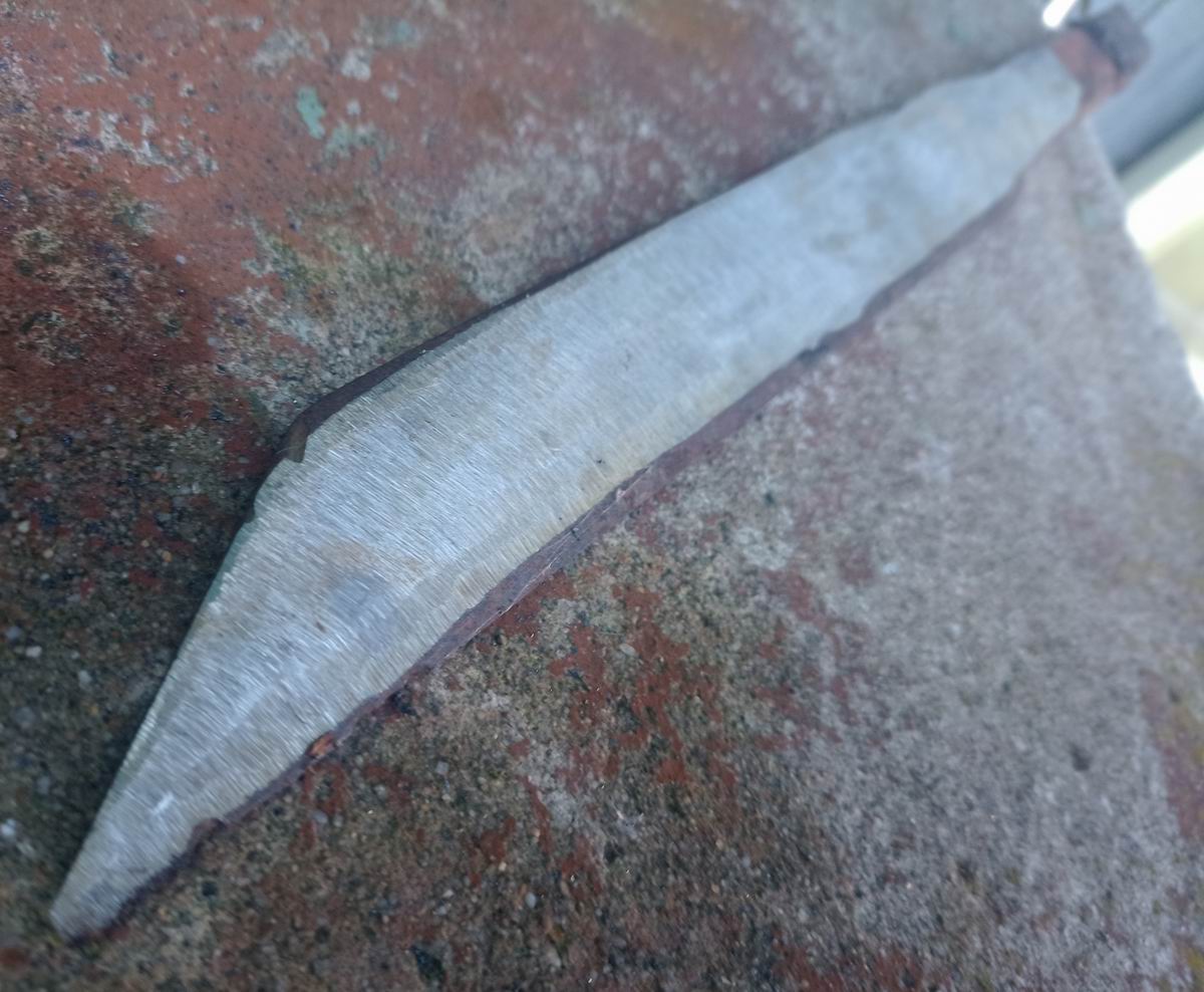 Durch Schleifen mit dem Winkelschleifer habe ich die Klinge von der Dicke her halbiert. Hat einige Zeit gedauert.