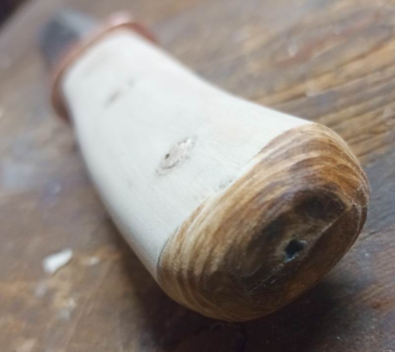 Die Hilze habe ich zweiteilig aus Walnussholz hergestellt, vom eigenen Baum natürlich. Die gewachsene Krümmung des Holzes habe ich übernommen. Befestigt mittels Holzleim und drei durchgehenden Messingstiften, beidseitig vernietet.