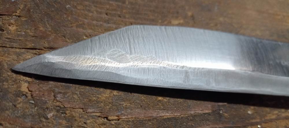Ich hatte darüber nachgedacht aber verworfen. Zum Härten fehlen mir die Mittel und ich wollte eine Beschädigung der Klinge durch Risse und/oder Verwerfungen vermeiden. Die Klinge erreichte beim Schleifen eine Temperatur nur etwas über den Siedepunkt von Wasser. Das Schleifen erfolgte ohne viel Druck mit dem Winkelschleifer auf das Material. Sie verfärbte sich nicht und ich habe sie zwischendurch immer wieder mit Wasser gekühlt.
