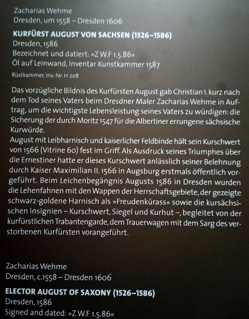 August (* 31. Juli 1526 in Freiberg; † 11. Februar 1586 in Dresden), der sich selbst Augustus nannte und unter Bezug auf seine landesväterliche Stellung im Volksmund auch Vater August hieß, war von 1553 bis zu seinem Tod Kurfürst von Sachsen aus der albertinischen Linie des Hauses Wettin. Er folgte seinem ohne männlichen Erben in der Schlacht bei Sievershausen gefallenen Bruder Moritz auf den Thron. (Quelle: