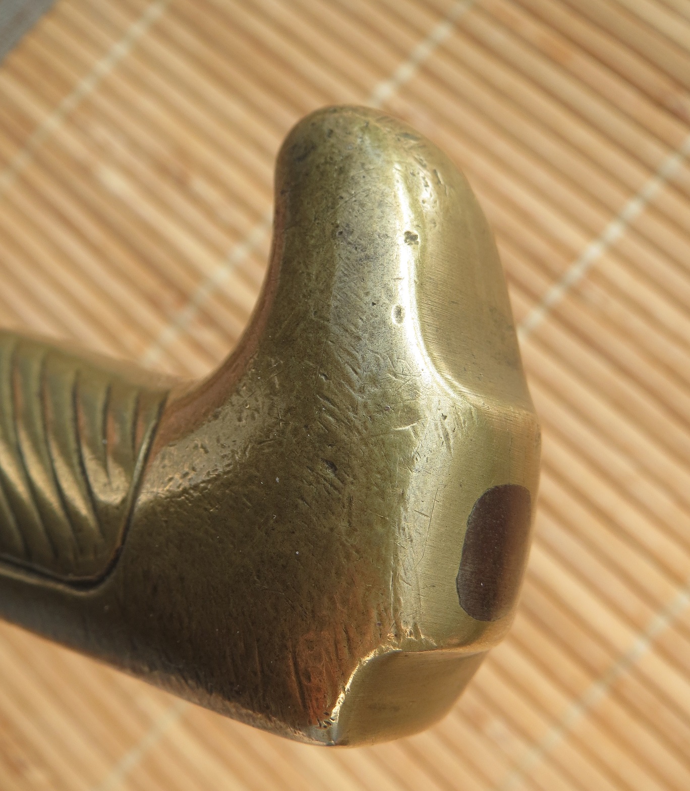 Die Naht der Lederscheide ist leider offen, Mundblech und Messingspitze mit Abnahmemarken.