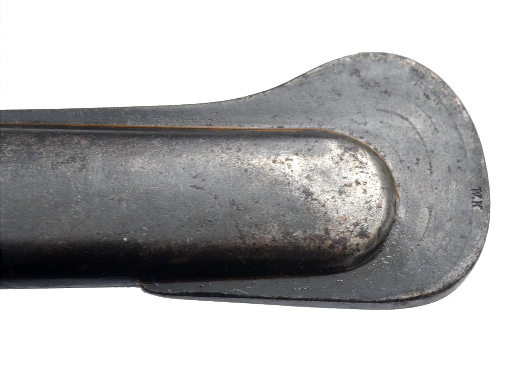 leicht gekrümmte, blanke, einschneidige Rückenklinge mit beidseitiger Hohlbahn, Mittelspitze