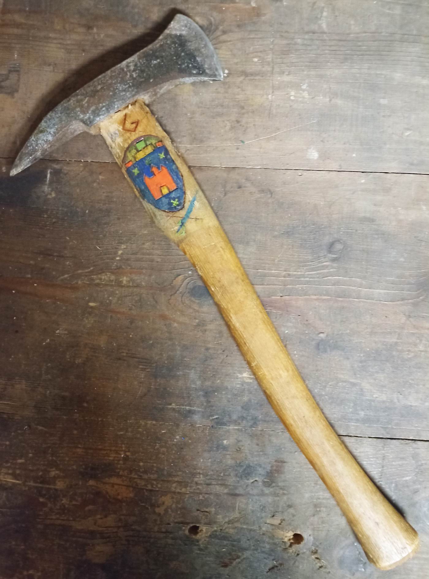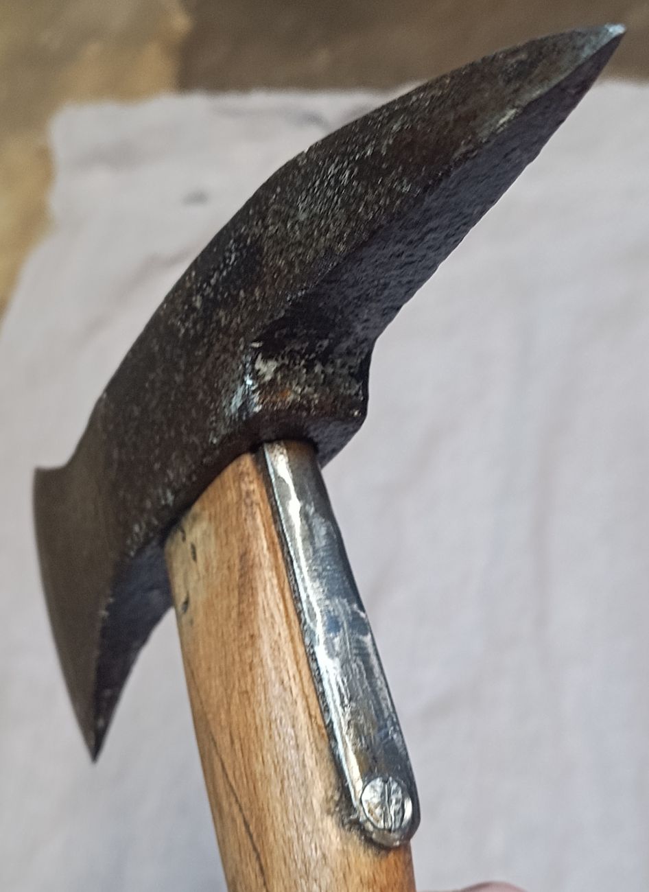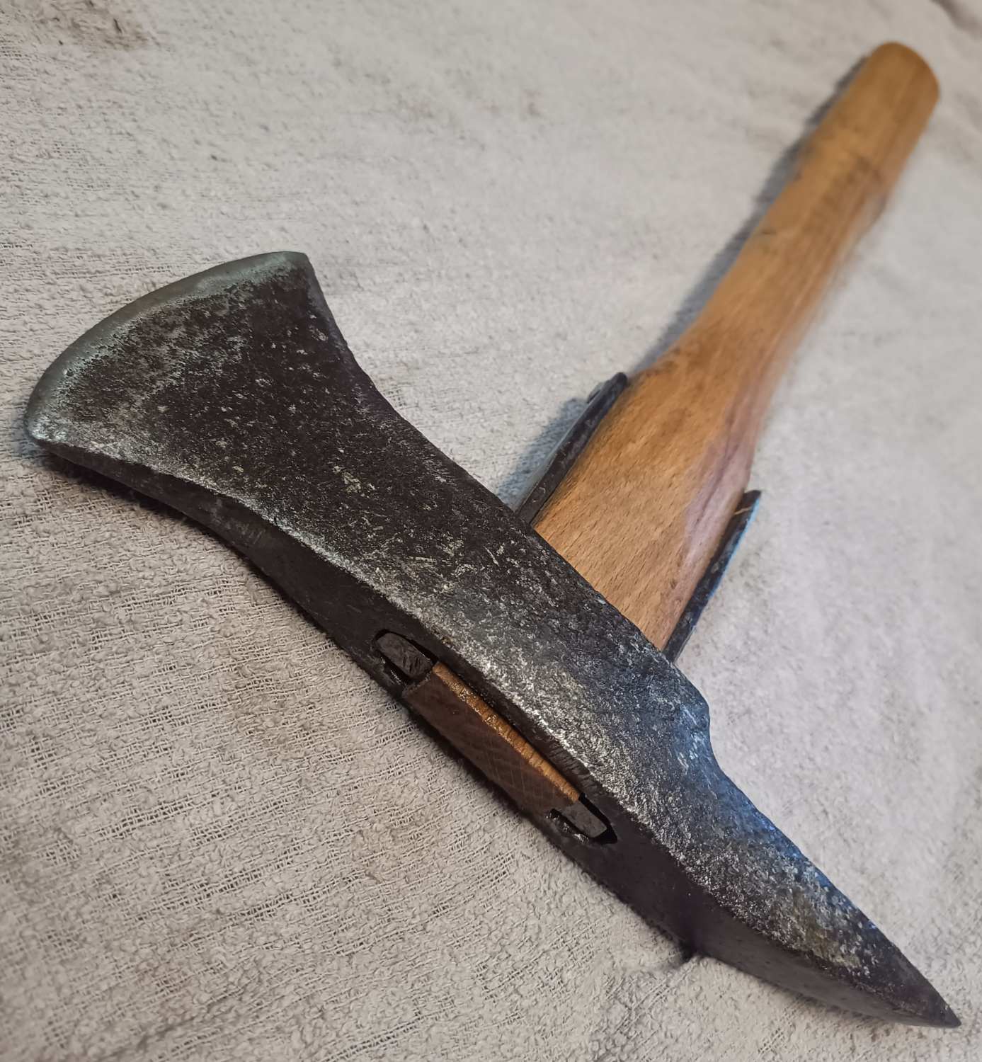 Ledertasche, Stielbemalung, -befestigung und -umwicklung sind natürlich nicht ursprünglich, aber eine Frage stellt sich mir doch. Gab es auch zivile Beilpicken?