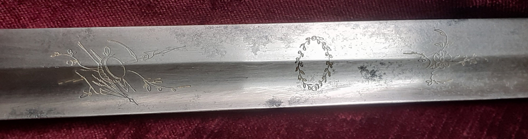 Bei dem von mir erworbenen Degen sind nur die zeittypischen Darstellungen von Waffentrophäen und floralen Zierelementen zu sehen.