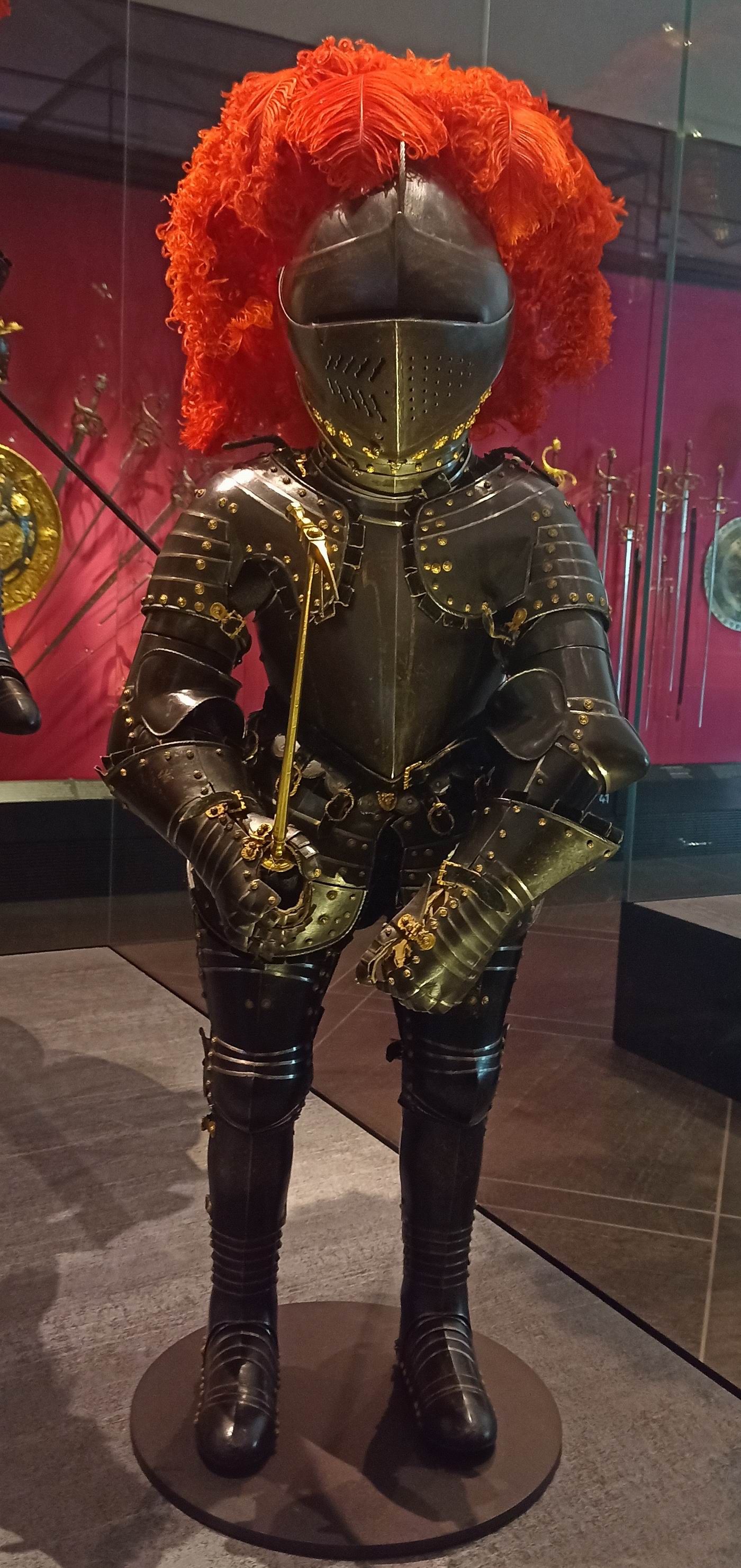 Die Ausbildung der Kurprinzen mit Waffen und Harnischen diente in gleicher Weise der standesgemäßen Ausbildung und der fürstlichen Repräsentation. Um 1590 ließ Kurfürst Christian I. von Sachsen für seine Söhne Christian (II.) und Johann Georg (I.) und August (späterer Administrator von Naumburg) von Peter Speyer drei kleine Knabenharnische Schlagen, die sich zusammen mit Kinderwaffen und einem Sattel nebst Rossstirn für ein Pony in der Dresdner Rüstkammer erhalten haben. Auf schwarzem Grund sind Reste eines goldgemalten Dekors zu erkennen. Deutlich sichtbar ist auch die unterschiedliche Größe der drei Harnische, deren Träger 1590 sieben, fünf und ein Jahr alt waren. Zumindest für den jüngsten Sohn war der Harnisch demnach eine Investition für die Zukunft. (Quelle: Dresden, Residenzschloss, Rittersaal)