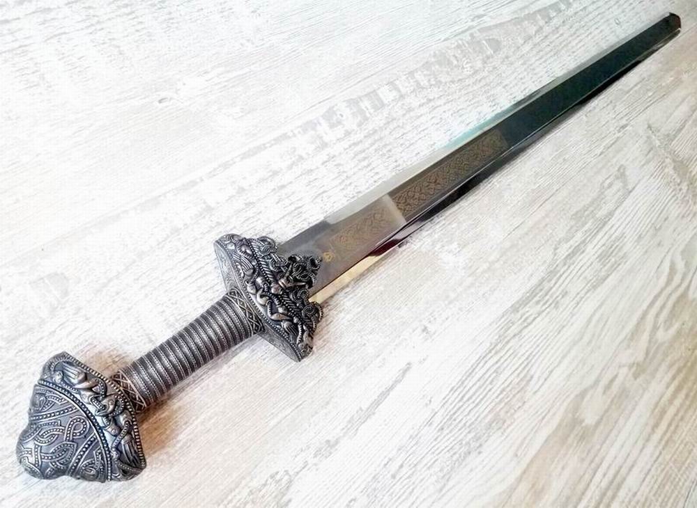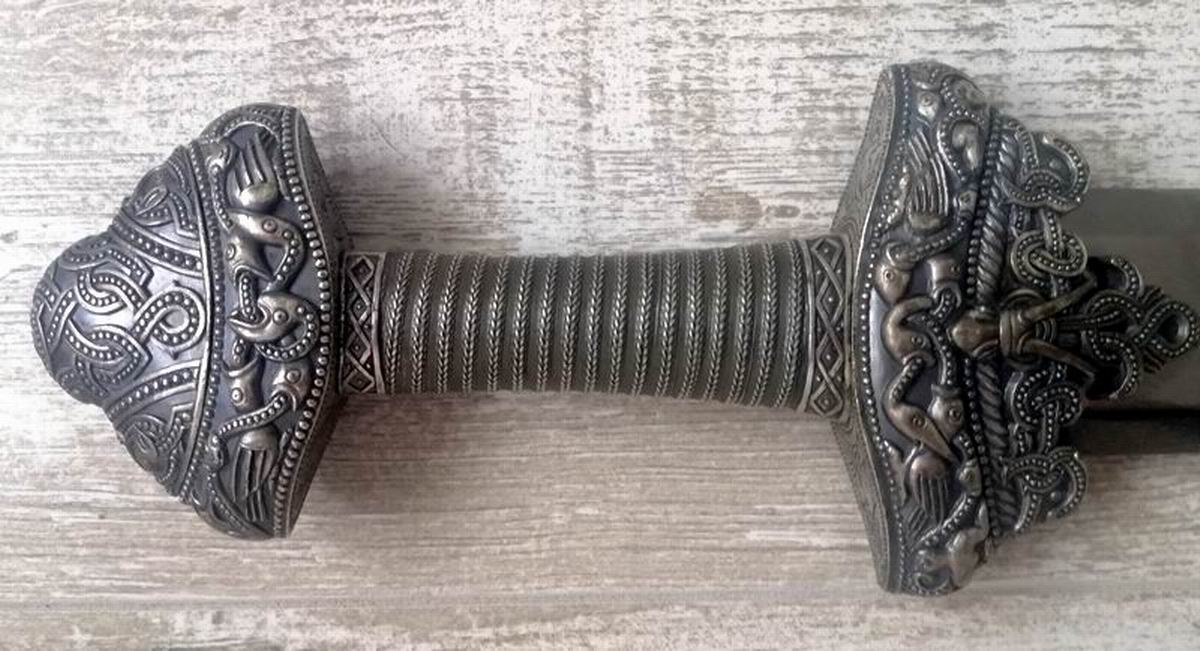 Als Wikingerschwert hat es eine eigenartige "Parierstangenerweiterung" zur Klinge hin. Da das Schwert einem Originalfund nachgebaut ist könnte man von einer kleinen Sensation ausgehen. Allerdings ist die als besondere Parierstangendekoration interpretierte Zusatzverzierung höchstwahrscheinlich der am Fundschwert anhaftende obere Scheidenabschluss. Hier ist das Mundstück der Scheide einfach mal fehlinterpretiert worden.