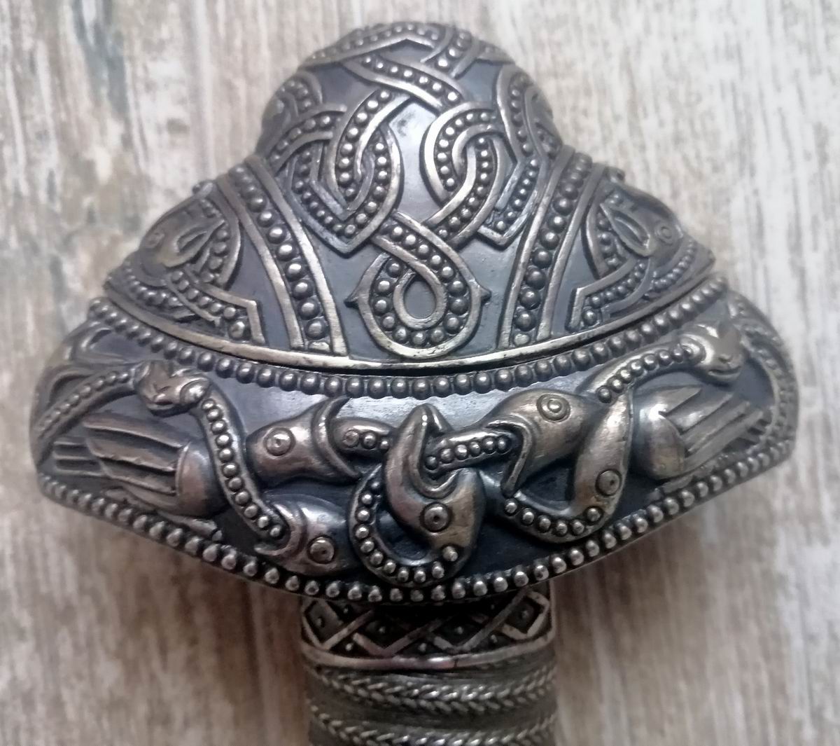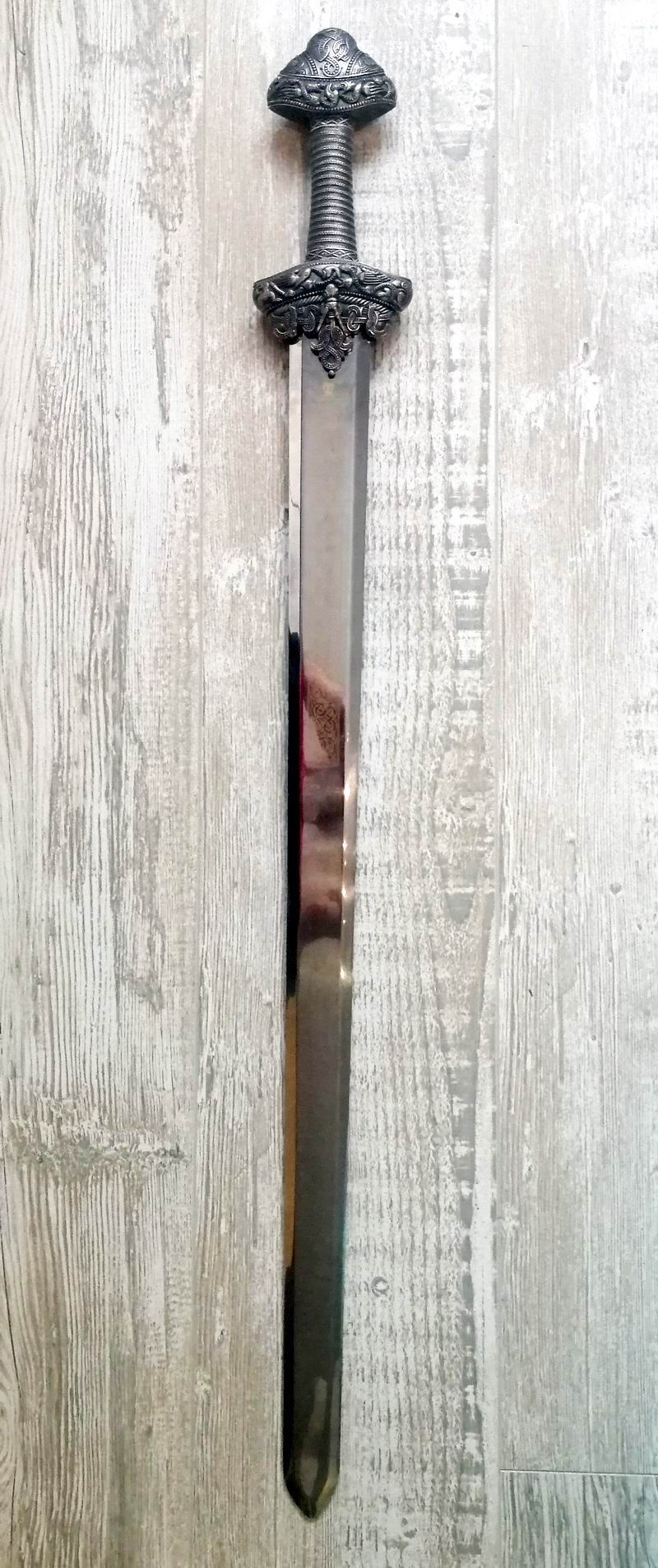 Gekauft habe ich es 2021 im Konvolut mit 11 weiteren Wikingerschwertern. Der Griff ist aus Buntmetall gefertigt und die Klinge aus 420er rostfreiem Edelstahl. Es ist somit ein reines Deko-Objekt, weshalb ich es unmittelbar nach dem Auspacken wieder verkauft hatte. Wollte es dennoch mal hier gezeigt haben.