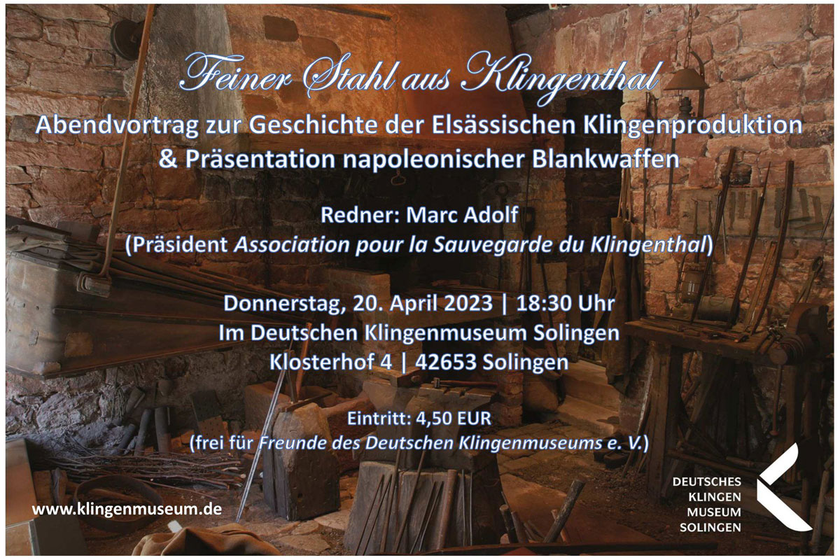 Im 18. Jahrhundert verließ eine größere Zahl Solinger Handwerker das Bergische Land: Die französische Krone hatte sie angeworben, im Elsass eine Blankwaffenproduktion aufzubauen. So entstand das Örtchen Klingenthal in den Vogesen, dessen Produktion zeitweise diejenige in Solingen sogar überstieg. Heute erinnert ein Museum in Klingenthal an die Tradition des Ortes (https://www.klingenthal.fr/). Marc Adolf, Präsident der Association pour la Sauvegarde du Klingenthal, spricht in seinem Abendvortrag über die Geschichte und Erzeugnisse der dortigen Blankwaffenfertigung.