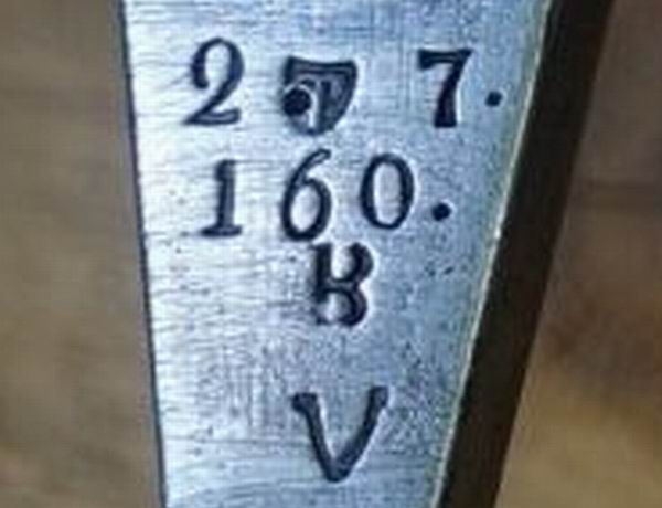 Nach der Vorschrift über die Kennzeichnung der württembergischen Waffen: Alle Seitengewehre werden an der unteren Fläche der Parierstange bezeichnet“. Nach dieser handelt es sich um das 2. Regiment, 7. Kompagnie und das Faschinenmesser Nr. 160. Der oben mittig befindliche Stempel und die beiden unteren Buchstaben-Stempel lassen sich aus der Vorschrift nicht erklären.