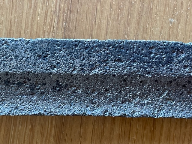Man beachte die unterschiedlich großen Stellen die der Rost in den Stahl "gefressen" hat. Gängige Fälschungsmethoden beruhen augenscheinlich auf lediglich einigen wenigen Durchgängen der künstlichen Alterung, sodass die Oxidationsschäden bei Falsifikaten mehr oder minder homogen wirken können.