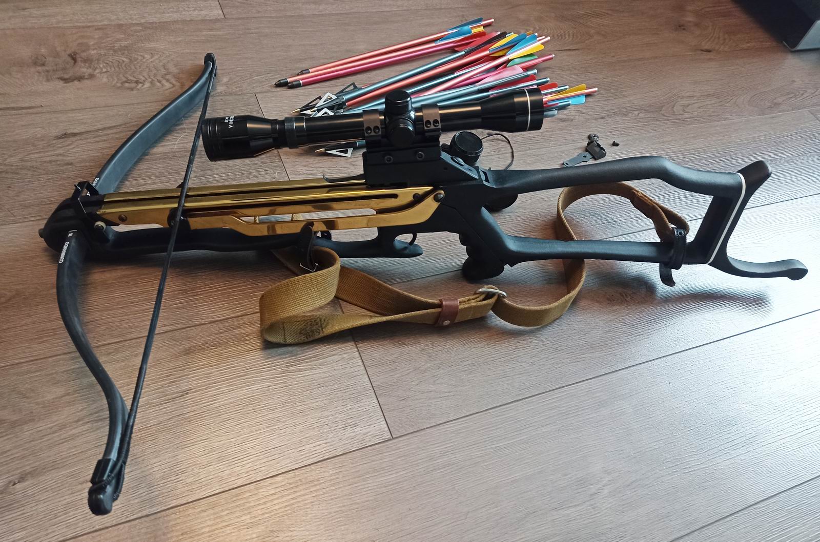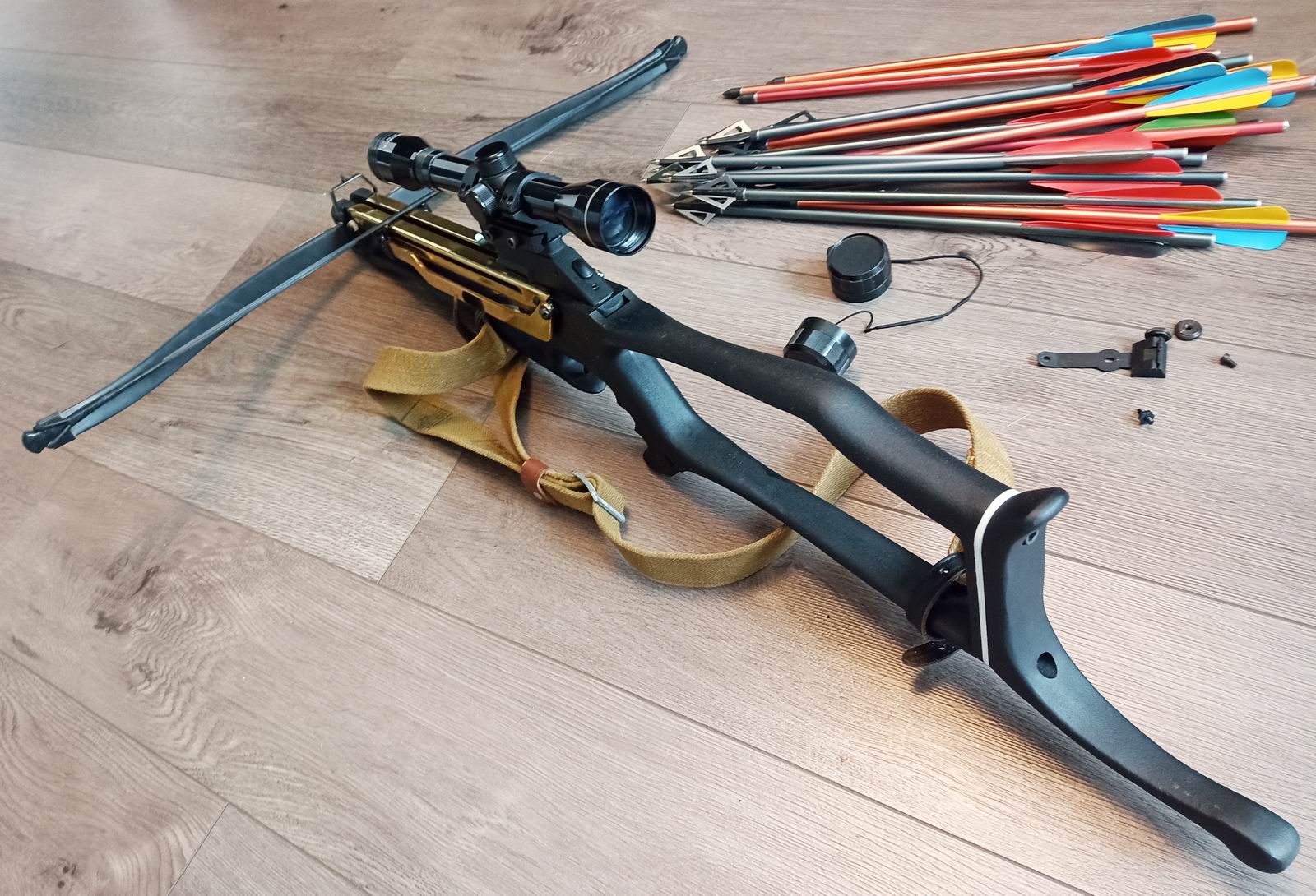 Mit dabei ist eine Zielvorrichtung, etliche Pfeile, Wachs für die Sehne und eine Tragetasche. Die Armbrust stammt aus einem Nachlass. Der Vorbesitzer hatte sie nicht oft oder gar nicht benutzt, weshalb sie noch sehr stramm in allen mechanischen Teilen daherkommt.