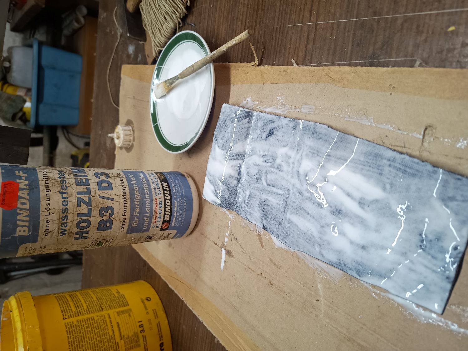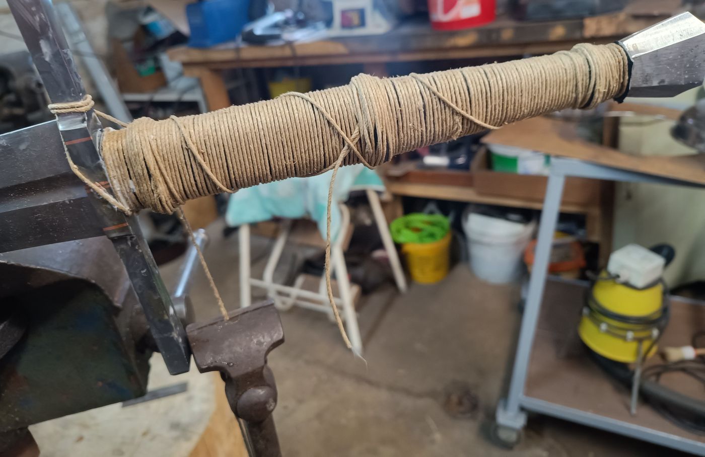 Tatsächlich handelt es sich in meinem Fall nicht um Schnur. Die schnurförmige Struktur stammt von der Hanfkordel, die ich beim Kleben des Leders stramm um die Hilze wickle. Da ich meine Arbeitsschritte meist dokumentiere, hier mal ein paar Fotos von der Griffbelederung mit anschließender Fixierung mittels Hanfschnur. Bislang hatte ich auch unterm Leder eine Schnur gewickelt, aber das mache ich seit diesem Jahr nicht mehr.