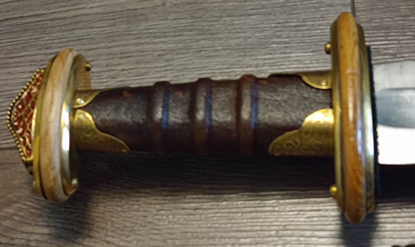 Der originale Schwertgriff aus dem Schiffsgrabfund. Material Gold und Emaille. Man kann die feinen aber deutlichen Unterschiede zur Repro erkennen, aber im Großen und Ganzen kommt es dem Original einigermaßen nahe.