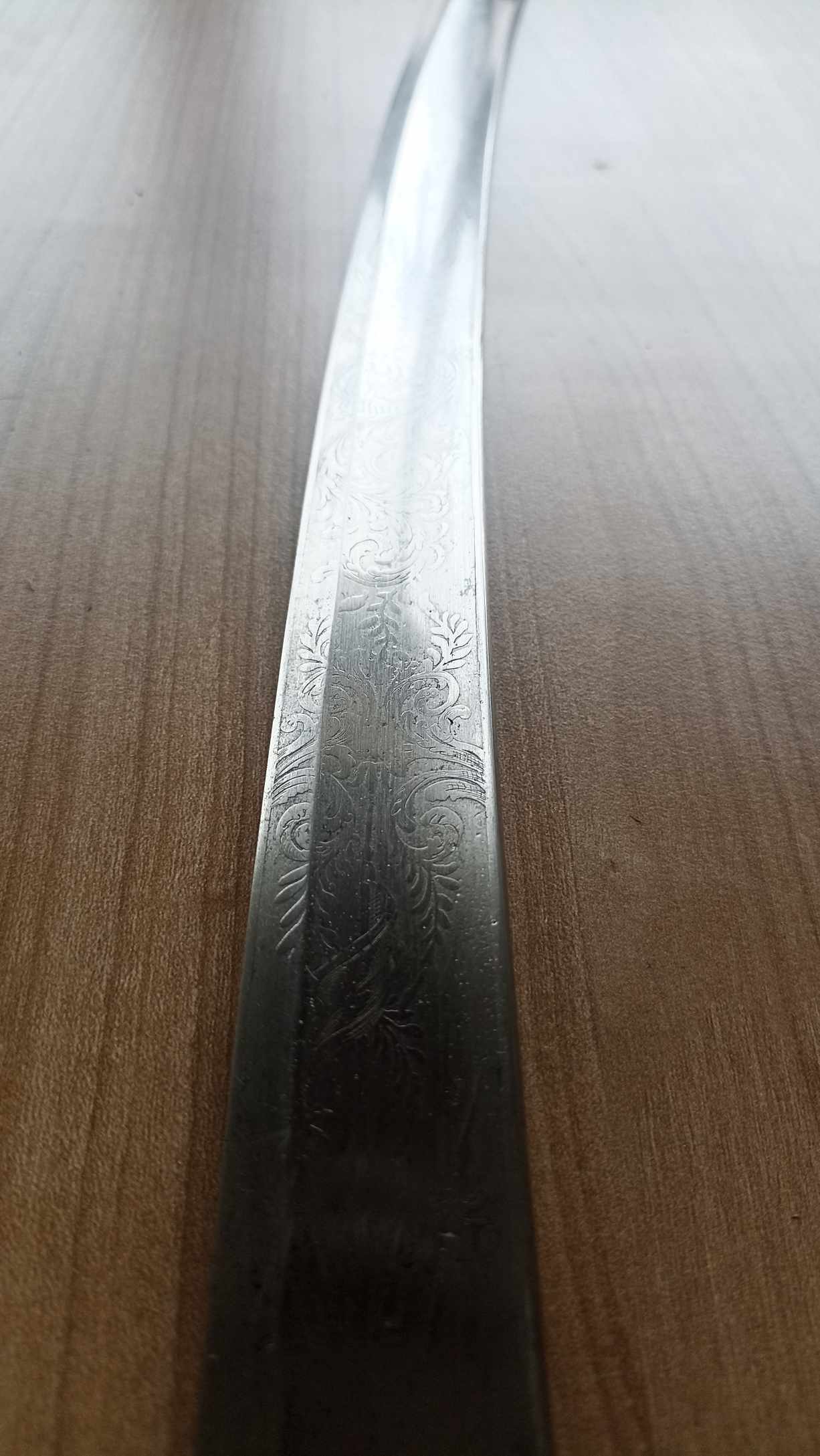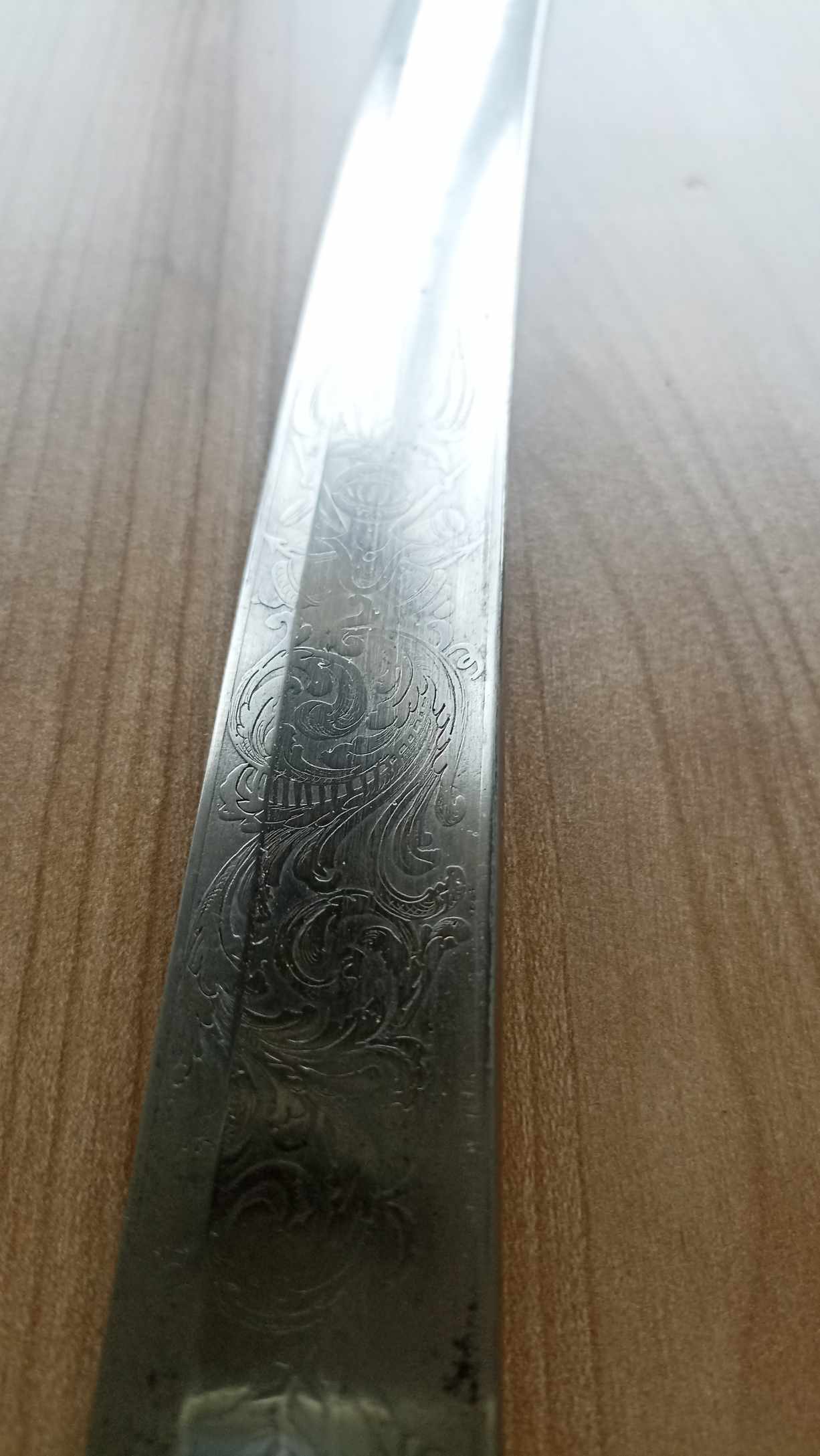 Die Scheide ist gebräunt und die Klinge scheint sowohl Gravuren als auch Säureätzungen zu haben.