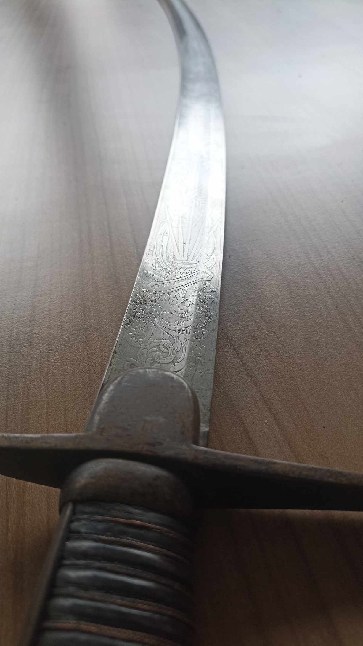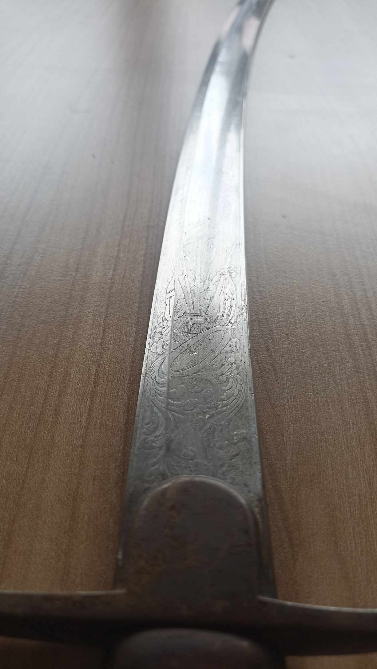 Eine gute Frage. Auf den ersten Blick mag er wie ein ungekürzter Artillerie-Säbel aussehen, aber dann sprechen die Klingenätzung, fehlende Griffkappenlappen und die Griffwicklung dagegen. Das sieht ja alles eher nach einer Offizierswaffe aus. Ob der Säbel deutsch ist, sein einmal dahingestellt. Ohne bessere und mehr Bilder bleibt es bei puren Spekulationen. Wichtig wären evtl. Herstellersignaturen unter den Parierstangenlappen oder im Klingenrücken. Auch die Ätzungen könnten weitere Rückschlüsse erlauben. Die Maße der Waffe wären evtl. auch interessant.