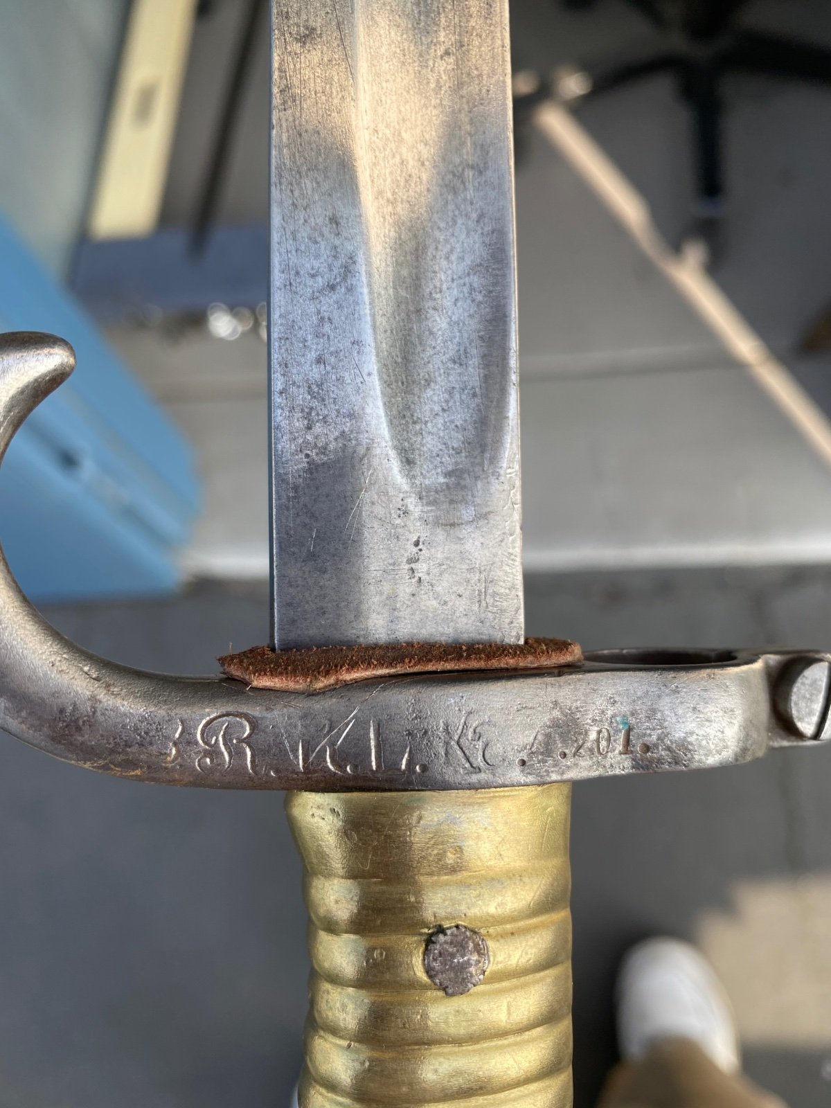 Hallo liebe Sammlerfreunde ein amerikanischer Sammler Steve N. hat 3 Stueck von Werder M1869 aptiert bajonett, wobei die haben alle neu nummer in 3ziffer bereich gekriegt am klingen ruecken am rechten seite von Parierstange und am griff ruecken, es sind nummer 235, 422 und 618. Alle griffe nehme ich an wurden von angel entfernt, die parierstange wurde gewechselt oder ueberarbeitet fuer hoeheres ring, es liegt 6-8mm ueber dem Griff, also sollte es nicht fuer altes Werder realisierbar sein, der gewehr slot was vor den ueberhollung leicht abgenommen worden. Bei einigen Stuecken ist sichtbar das die erste rippe hinter pariestange auf dem Griff eine kurzung aufweisst. Das erste griff niete wurde gewechselt. An 2 Stuecke sind da alte Landwehr einheiten vorhanden, am rechten seite von parierstange auch die gewehr nummer noch vorhanden (44xx4 bei 235 und 81130 bei 422), alle wurden von alten Werder gemacht, gestempelt Solingen Weyersberg und Stamm.