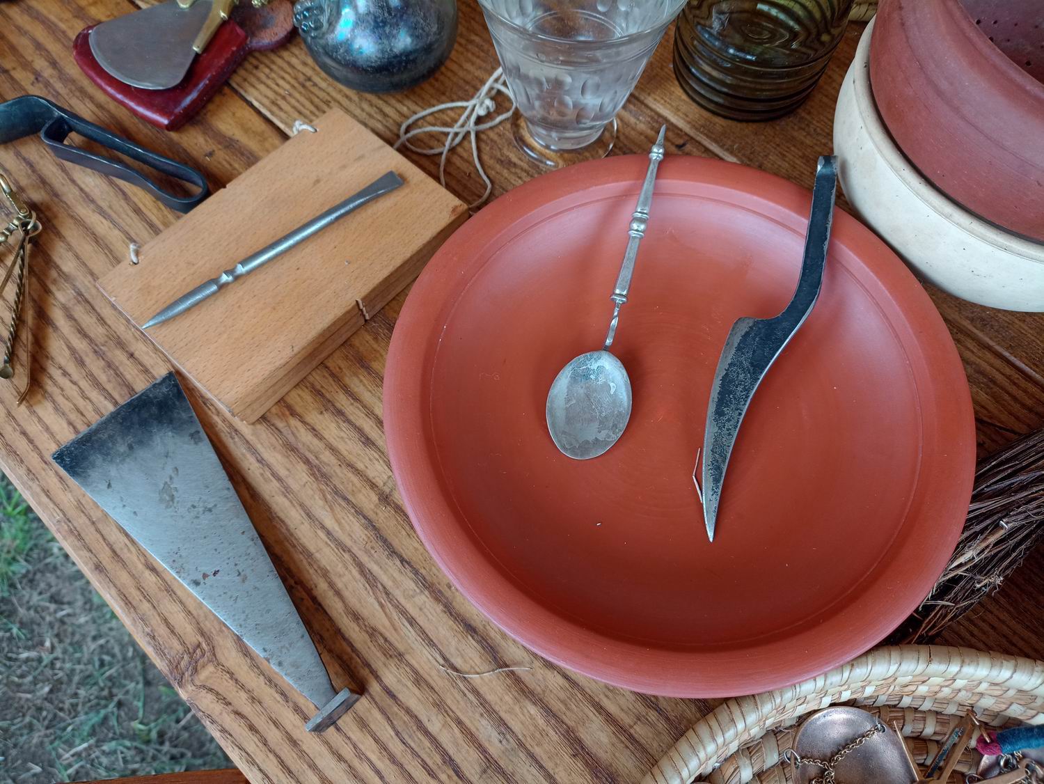 Der erste Stand auf dem Gelände, wenn man durch das Museum den Hof betritt, hatte der Fische inne. Eine Dame hatte ihn gezielt mit ganz interessanten Fragen "gelöchert", so dass ich mich tatsächlich nur daneben stellen brauchte und meine Ohren spitzte. Seine Informationen reichten von der Zeit vor den Kelten, über die Römerzeit bis hin zur Gegenwart. Alle auf den Fotos sichtbaren Objekte sind exakte Nachbildungen und Originale antiker Funde. Das ist Museumsreif. Apropos Museum, er hat auch schon Gegenstände an Museen verliehen, für thematisch verwandte Themen.