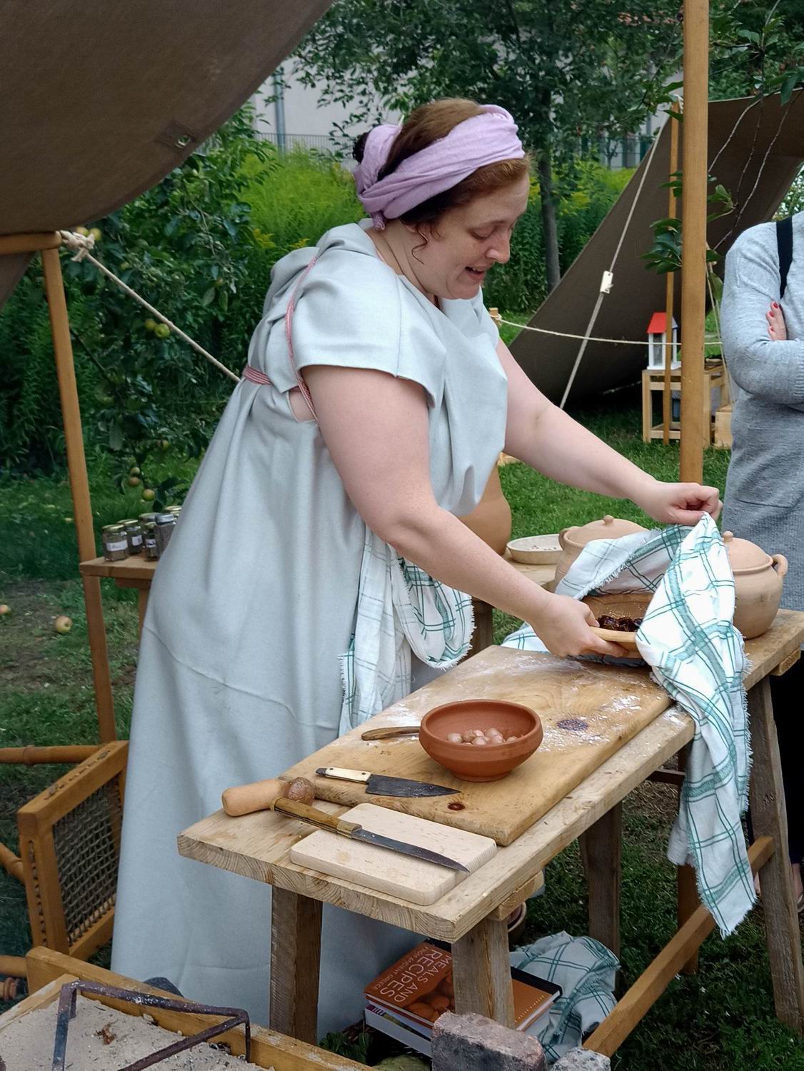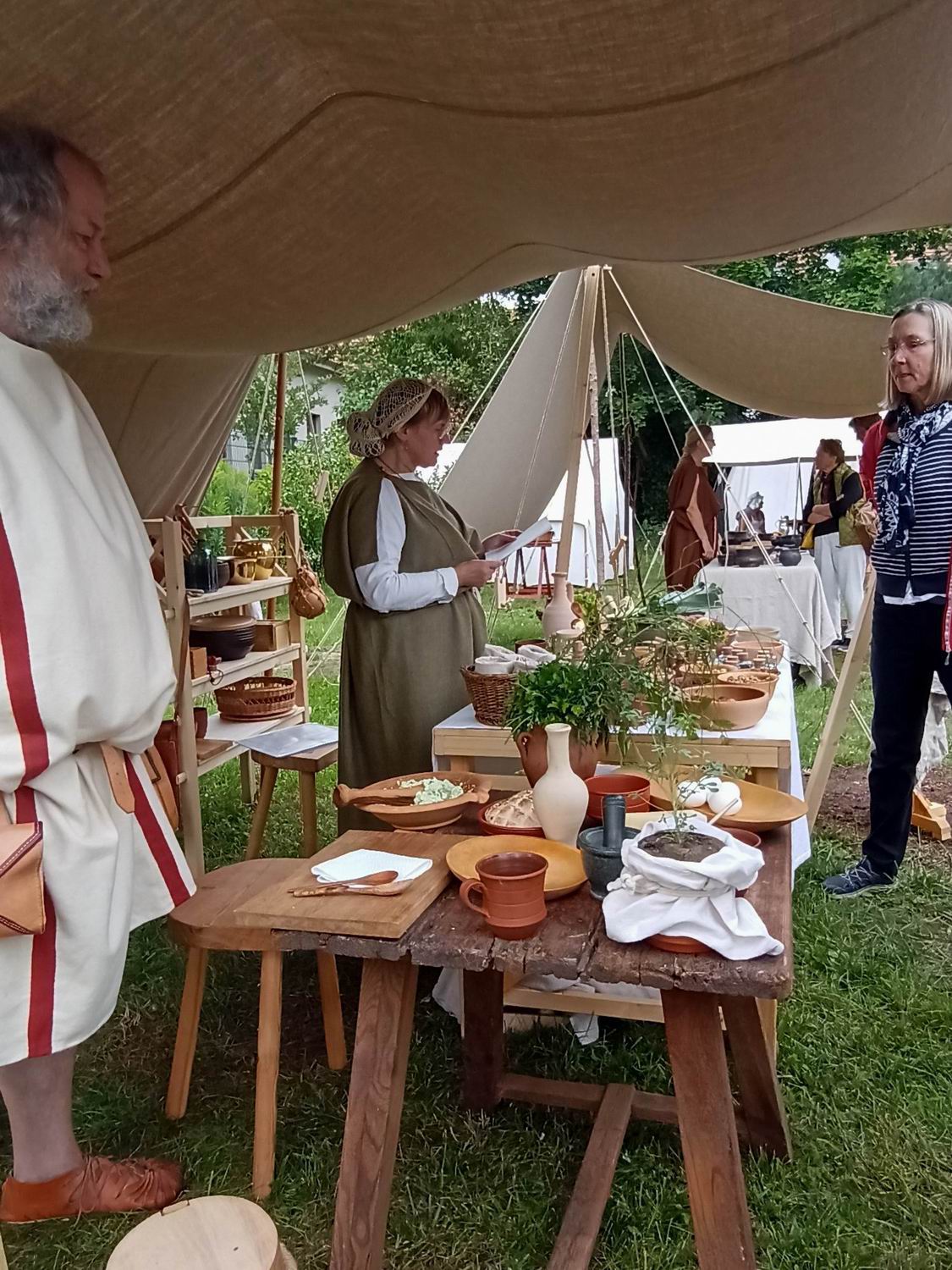 Die liebe Agnes war das erste Mal auf der Archäotechnica und war begeistert. Zumal es dieses Jahr nicht um Waffen ging und eigentlich auch nicht um ihr sonstiges Repertoire, mittelalterliche Stoffe. Hier konnte sich sich beim Kochen auslassen, was ihr sehr gefiel. Wir Besucher haben an ihren mitgebrachten Gewürzen gerochen, wobei ich feststellen musste, dass ich zwar einiges vom Geruch her erkannte aber nicht wusste um was es sich handelt.
