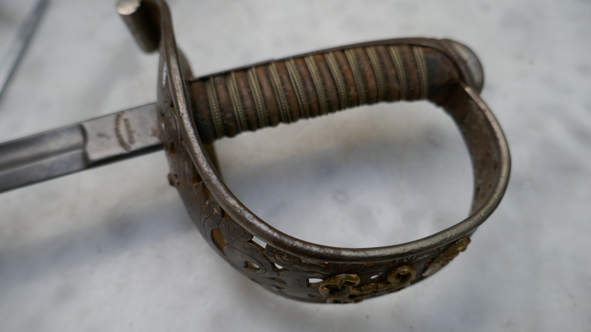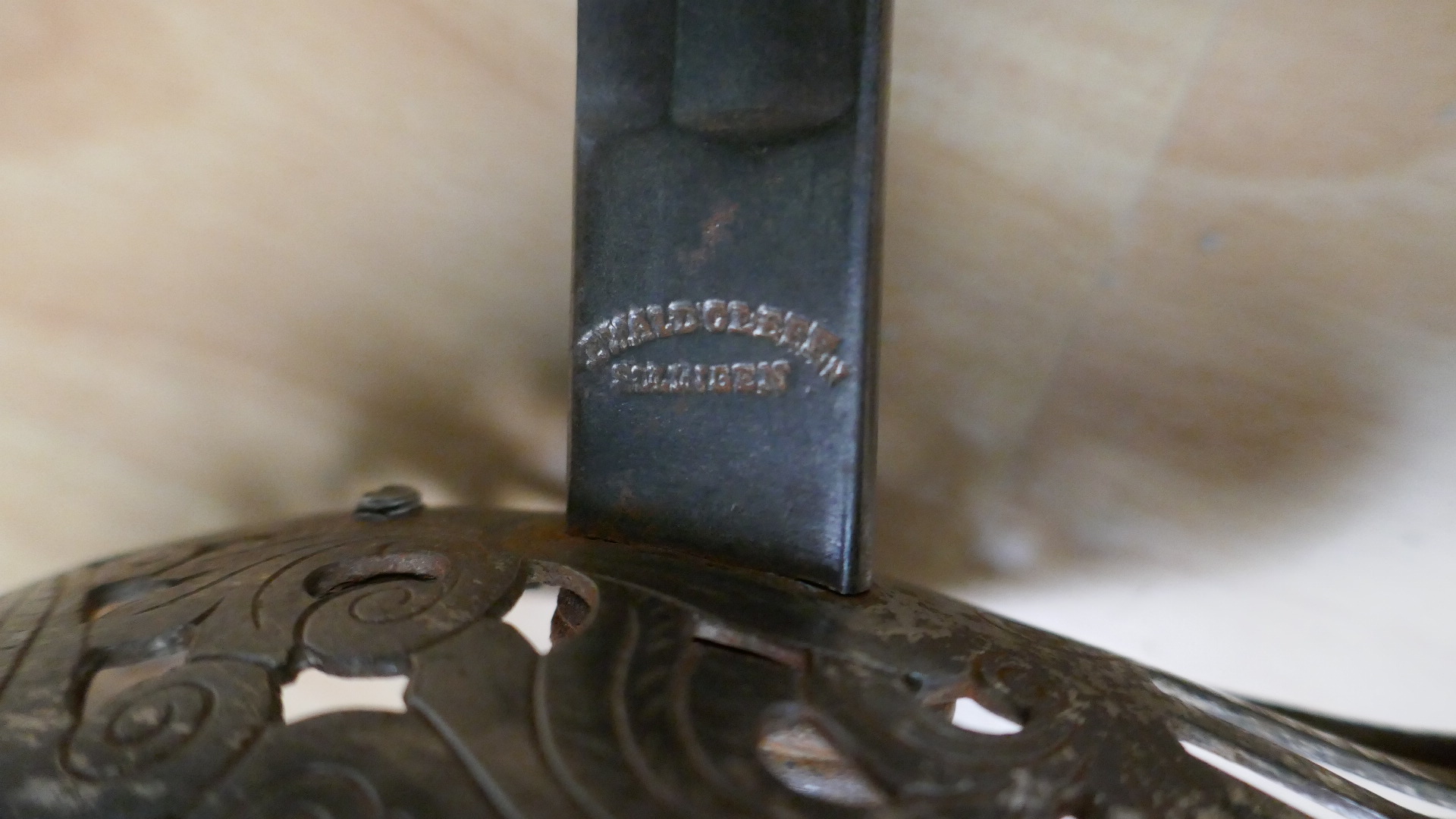 Es handelt es sich wahrscheinlich um einen Offiziersäbel aus dem Großherzoglich Hessischen Feldartillerie-Regiment Nr. 25. Das Herrscher-Monogramm aus Messing zeigt zwei verschlungene L unter Krone (Grossherzog Ludwig IV., 1889 - 1892). Die Griffauflage kommt wohl einteilig und zweiteilig vor.