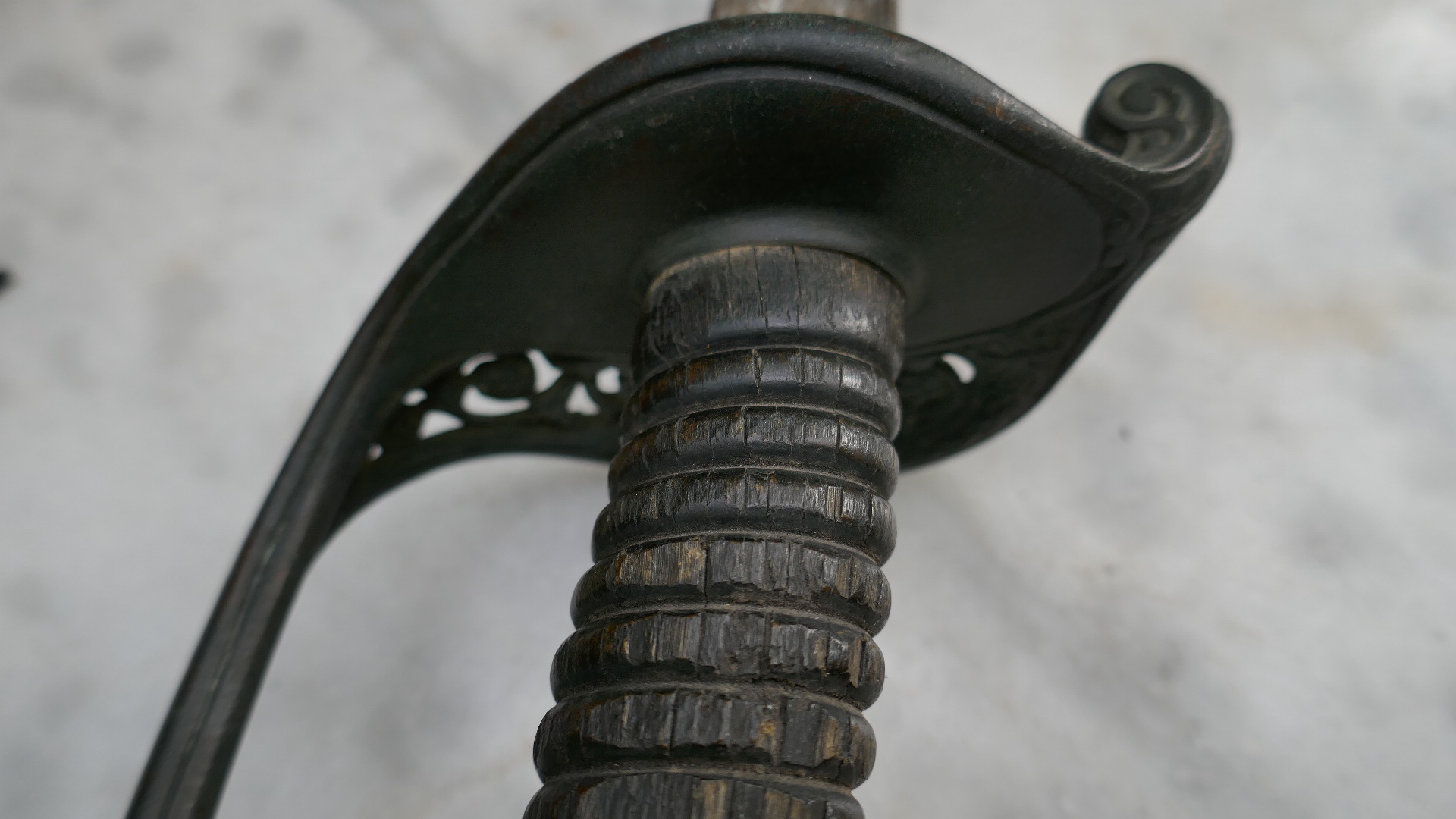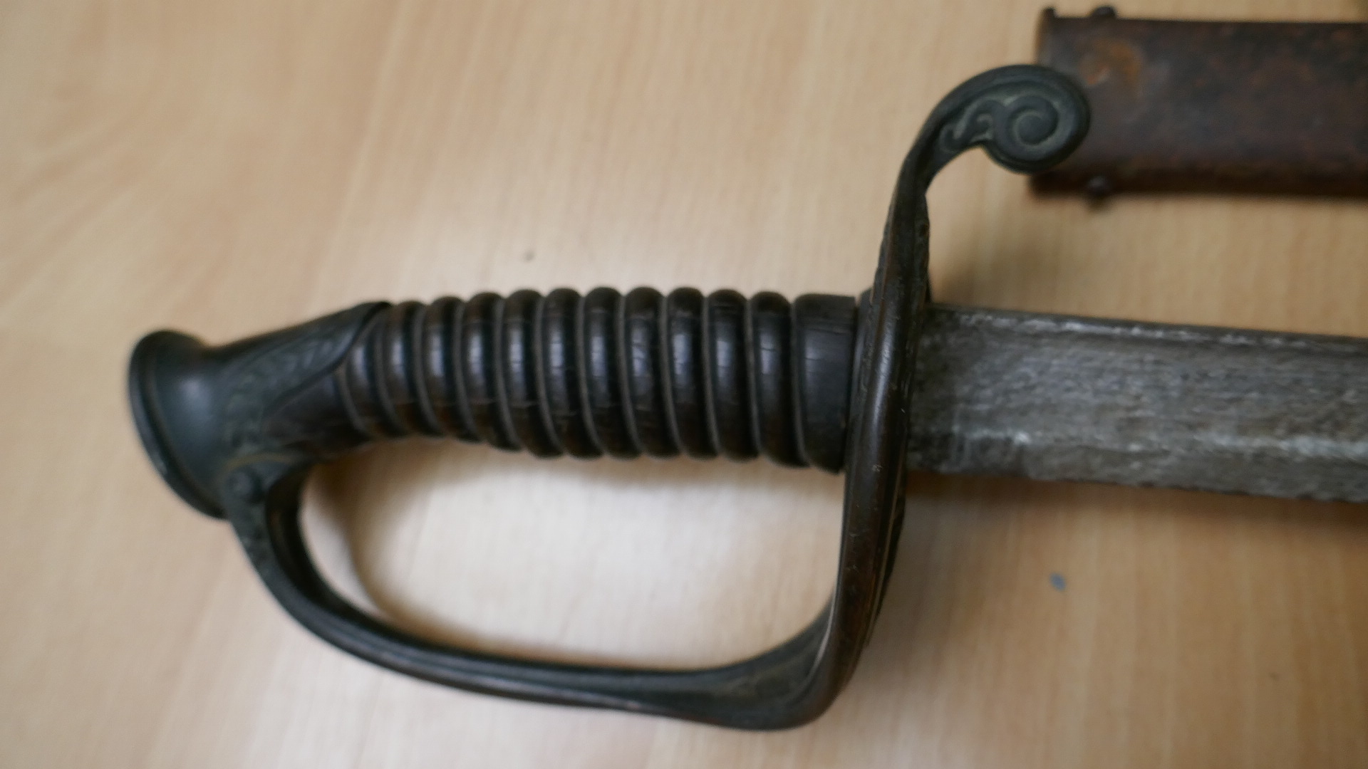 Die Klinge ist nicht sächsisch und auf dem Stichblatt befinden sich Kirschblüten. Hier handelt es sich um einen japanischen Polizeisäbel.