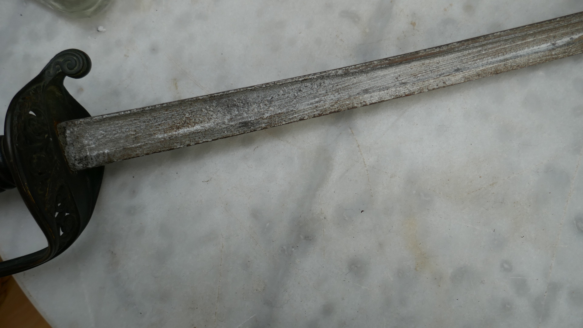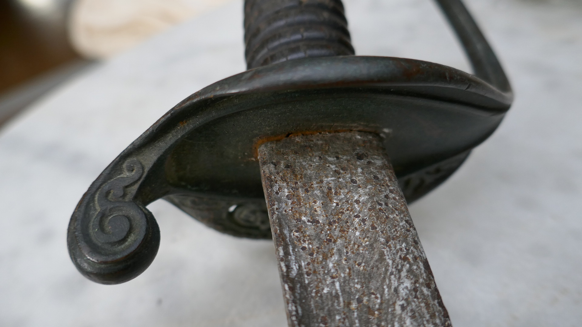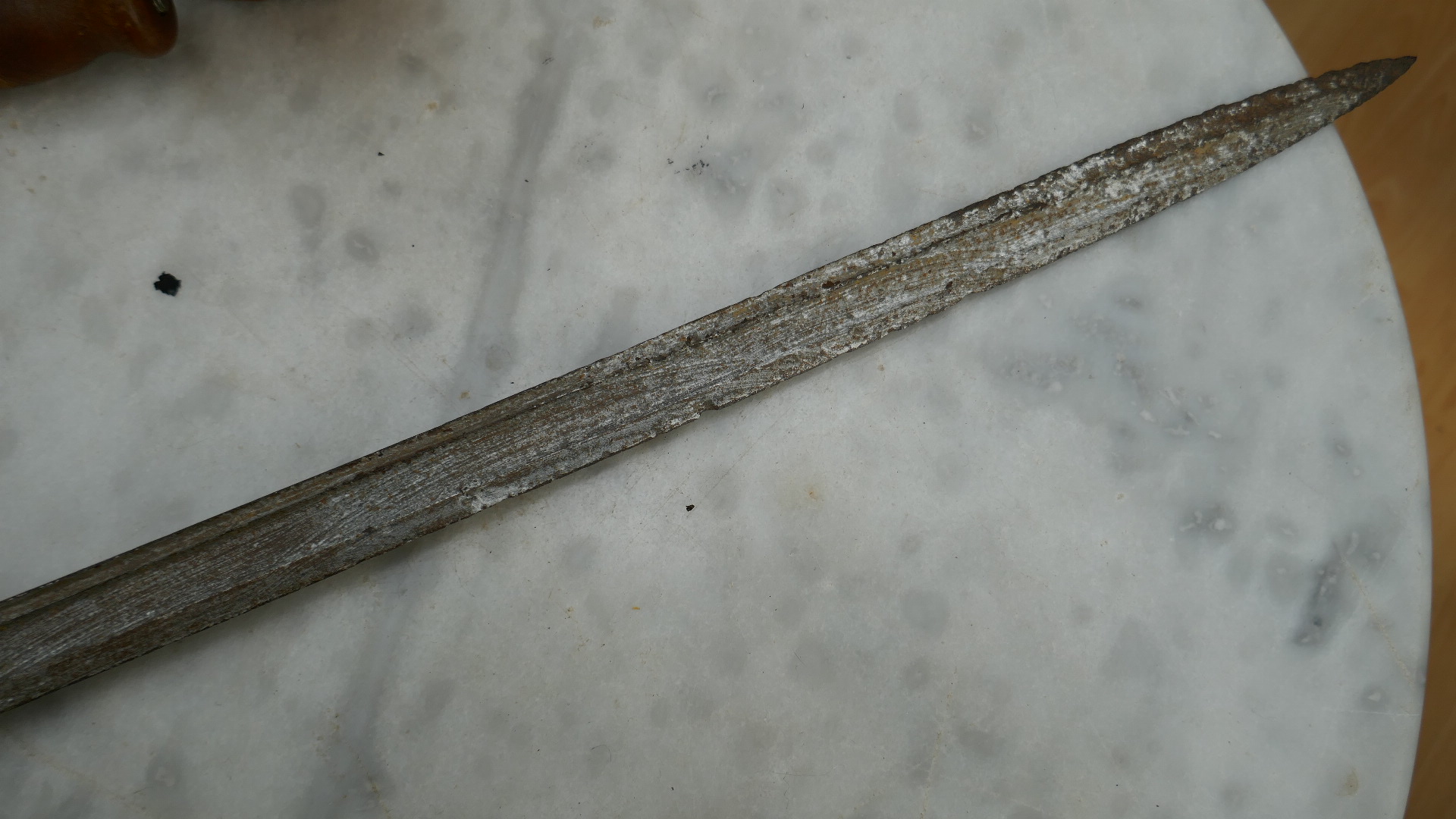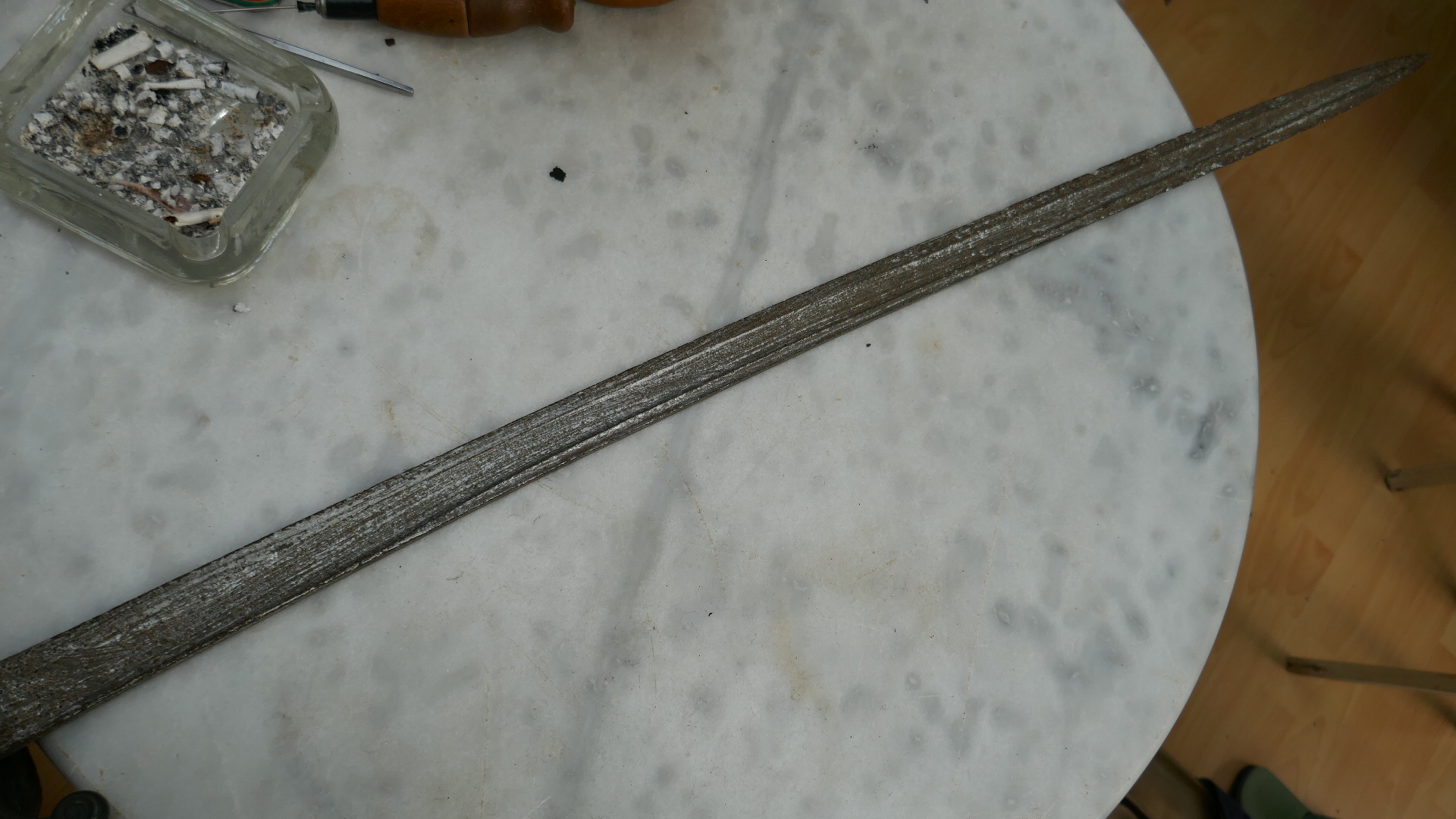 Sollten sich nicht noch irgendwelche Markierungen auf Klinge oder Gefäß finden, wird es mit einer Zuordnung sehr schwierig. Man kann es auf den Bildern nicht so gut erkennen, aber der Klingenquerschnitt scheint etwas ungewöhnlich. Evtl. liefert das noch Anhaltspunkte.