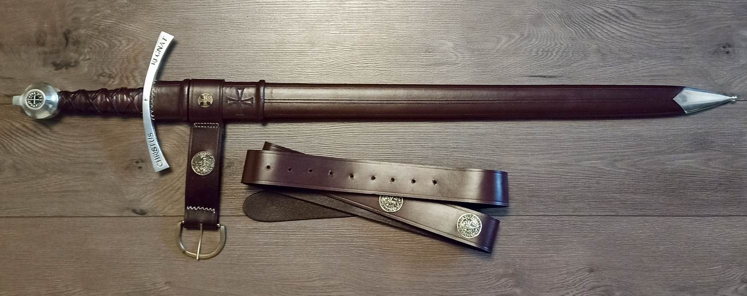 Das Schwert umfasst eine maßgefertigte, passende Scheide aus genarbtem Leder und einen historischen Gürtel, der sowohl mit dem Siegel als auch dem Kreuz des Templerordens verziert ist.